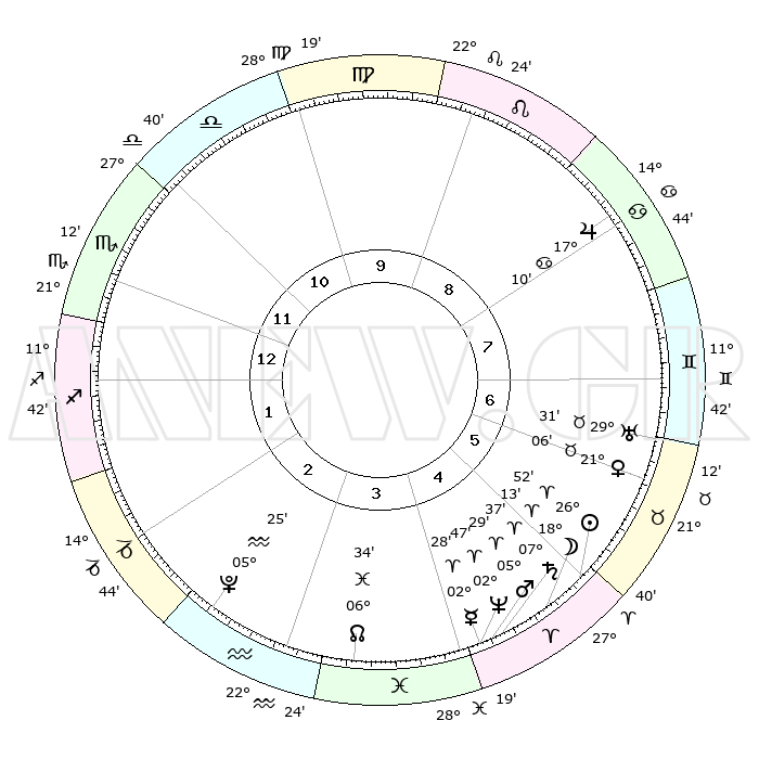 | | ΘΕΣΕΙΣ ΠΛΑΝΗΤΩΝ ΑΣΤΡΟΛΟΓΙΚΟΥ ΧΑΡΤΗ ΤΗΣ ΣΤΙΓΜΗΣ ΑΥΤΗΣ | | | | Πλανήτης | Ζώδιο | Μοίρες | Δεκαήμ. | Σε οίκο | Απόκλιση | | Ακμές των οίκων | | Ηλιος | Κριός | 26°49' | Τρίτο | 5 | 10 N 20 | | 1ος | 24°06' | Σκορπιός | | Σελήνη | Κριός | 17°21' | Δεύτερο | 5 | 09 N 49 | | 2ος | 24°29' | Τοξότης | | Ερμής | Κριός | 02°23' | Πρώτο | 4 | 01 S 28 | | 3ος | 29°14' | Αιγόκερως | | Αφροδίτη | Ταύρος | 21°02' | Τρίτο | 6 | 18 N 15 | | 4ος | 05°04' | Ιχθείς | | Αρης | Κριός | 05°26' | Πρώτο | 4 | 01 N 16 | | 5ος | 06°46' | Κριός | | Δίας | Καρκίνος | 17°09' | Δεύτερο | 8 | 22 N 43 | | 6ος | 02°37' | Ταύρος | | Κρόνος | Κριός | 07°36' | Πρώτο | 5 | 01 N 03 | | 7ος | 24°06' | Ταύρος | | Ουρανός | Ταύρος | 29°31' | Τρίτο | 7 | 19 N 53 | | 8ος | 24°29' | Δίδυμοι | | Ποσειδώνας | Κριός | 02°47' | Πρώτο | 4 | 00 S 06 | | 9ος | 29°14' | Καρκίνος | | Πλούτωνας | Υδροχόος | 05°25' | Πρώτο | 3 | 22 S 47 | | 10ος | 05°04' | Παρθένος | | Β. Δεσμός | Ιχθείς | 06°34' | Πρώτο | 4 | 09 S 06 | | 11ος | 06°46' | Ζυγός | | Ωροσκόπος | Σκορπιός | 24°06' | Τρίτο | | | 12ος | 02°37' | Σκορπιός | | Μεσουράνημα | Παρθένος | 05°04' | Πρώτο | | | |