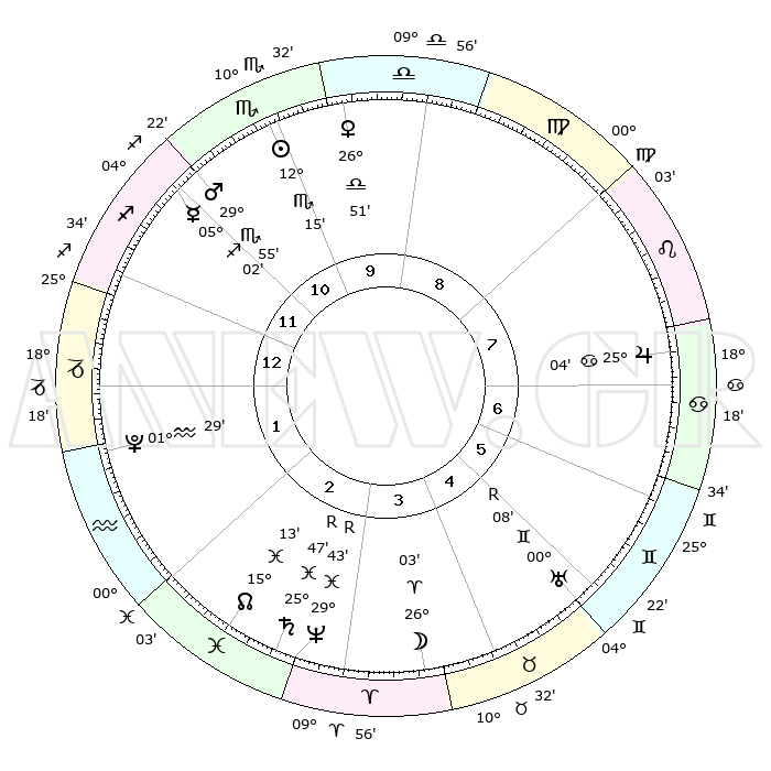 |  | ΘΕΣΕΙΣ ΠΛΑΝΗΤΩΝ ΑΣΤΡΟΛΟΓΙΚΟΥ ΧΑΡΤΗ ΤΗΣ ΣΤΙΓΜΗΣ ΑΥΤΗΣ |  |   |  | Πλανήτης | Ζώδιο | Μοίρες | Δεκαήμ. | Σε οίκο | Απόκλιση |   | Ακμές των οίκων |  | Ηλιος | Σκορπιός | 11°59' | Δεύτερο | 1 | 15 S 26 |   | 1ος | 00°35' | Σκορπιός |  | Σελήνη | Κριός | 22°17' | Τρίτο | 6 | 11 N 25 |   | 2ος | 29°02' | Σκορπιός |  | Ερμής | Τοξότης | 04°53' | Πρώτο | 2 | 23 S 55 |   | 3ος | 01°02' | Αιγόκερως |  | Αφροδίτη | Ζυγός | 26°32' | Τρίτο | 12 | 08 S 54 |   | 4ος | 05°16' | Υδροχόος |  | Αρης | Σκορπιός | 29°45' | Τρίτο | 2 | 20 S 30 |   | 5ος | 08°10' | Ιχθείς |  | Δίας | Καρκίνος | 25°04' | Τρίτο | 9 | 21 N 12 |   | 6ος | 06°47' | Κριός |  | Κρόνος | Ιχθείς | 25°47'R | Τρίτο | 5 | 03 S 56 |   | 7ος | 00°35' | Ταύρος |  | Ουρανός | Δίδυμοι | 00°09'R | Πρώτο | 8 | 19 N 58 |   | 8ος | 29°02' | Ταύρος |  | Ποσειδώνας | Ιχθείς | 29°44'R | Τρίτο | 5 | 01 S 22 |   | 9ος | 01°02' | Καρκίνος |  | Πλούτωνας | Υδροχόος | 01°28' | Πρώτο | 3 | 23 S 30 |   | 10ος | 05°16' | Λέων |  | Β. Δεσμός | Ιχθείς | 15°14' | Δεύτερο | 5 | 05 S 49 |   | 11ος | 08°10' | Παρθένος |  | Ωροσκόπος | Σκορπιός | 00°35' | Πρώτο |   |   | 12ος | 06°47' | Ζυγός |  | Μεσουράνημα | Λέων | 05°16' | Πρώτο |   |   |   |