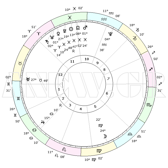 | | ΘΕΣΕΙΣ ΠΛΑΝΗΤΩΝ ΑΣΤΡΟΛΟΓΙΚΟΥ ΧΑΡΤΗ ΤΗΣ ΣΤΙΓΜΗΣ ΑΥΤΗΣ | | | | Πλανήτης | Ζώδιο | Μοίρες | Δεκαήμ. | Σε οίκο | Απόκλιση | | Ακμές των οίκων | | Ηλιος | Ιχθείς | 13°43' | Δεύτερο | 11 | 06 S 24 | | 1ος | 06°22' | Ταύρος | | Σελήνη | Παρθένος | 23°38' | Τρίτο | 6 | 01 N 18 | | 2ος | 06°51' | Δίδυμοι | | Ερμής | Ιχθείς | 19°51'R | Δεύτερο | 11 | 00 S 40 | | 3ος | 29°47' | Δίδυμοι | | Αφροδίτη | Ιχθείς | 27°20' | Τρίτο | 12 | 02 S 15 | | 4ος | 21°32' | Καρκίνος | | Αρης | Ιχθείς | 01°21' | Πρώτο | 11 | 12 S 01 | | 5ος | 16°37' | Λέων | | Δίας | Καρκίνος | 15°10'R | Δεύτερο | 3 | 22 N 55 | | 6ος | 20°36' | Παρθένος | | Κρόνος | Κριός | 02°14' | Πρώτο | 12 | 01 S 04 | | 7ος | 06°22' | Σκορπιός | | Ουρανός | Ταύρος | 27°48' | Τρίτο | 1 | 19 N 30 | | 8ος | 06°51' | Τοξότης | | Ποσειδώνας | Κριός | 01°10' | Πρώτο | 12 | 00 S 44 | | 9ος | 29°47' | Τοξότης | | Πλούτωνας | Υδροχόος | 04°37' | Πρώτο | 10 | 22 S 52 | | 10ος | 21°32' | Αιγόκερως | | Β. Δεσμός | Ιχθείς | 08°52' | Πρώτο | 11 | 08 S 15 | | 11ος | 16°37' | Υδροχόος | | Ωροσκόπος | Ταύρος | 06°22' | Πρώτο | | | 12ος | 20°36' | Ιχθείς | | Μεσουράνημα | Αιγόκερως | 21°32' | Τρίτο | | | |