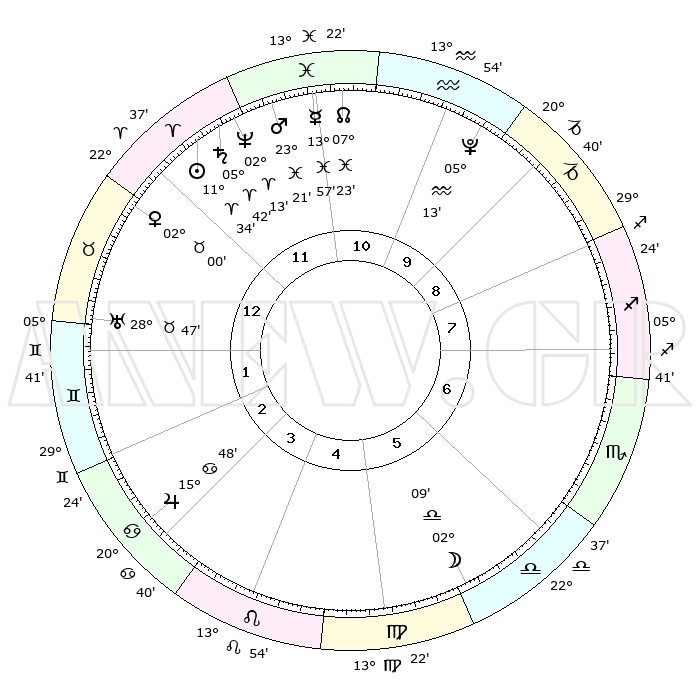 | | ΘΕΣΕΙΣ ΠΛΑΝΗΤΩΝ ΑΣΤΡΟΛΟΓΙΚΟΥ ΧΑΡΤΗ ΤΗΣ ΣΤΙΓΜΗΣ ΑΥΤΗΣ | | | | Πλανήτης | Ζώδιο | Μοίρες | Δεκαήμ. | Σε οίκο | Απόκλιση | | Ακμές των οίκων | | Ηλιος | Κριός | 11°30' | Δεύτερο | 12 | 04 N 33 | | 1ος | 07°28' | Ταύρος | | Σελήνη | Ζυγός | 01°21' | Πρώτο | 6 | 02 S 23 | | 2ος | 07°39' | Δίδυμοι | | Ερμής | Ιχθείς | 13°54' | Δεύτερο | 11 | 07 S 34 | | 3ος | 00°30' | Καρκίνος | | Αφροδίτη | Ταύρος | 01°56' | Πρώτο | 12 | 11 N 44 | | 4ος | 22°16' | Καρκίνος | | Αρης | Ιχθείς | 23°18' | Τρίτο | 12 | 03 S 37 | | 5ος | 17°28' | Λέων | | Δίας | Καρκίνος | 15°48' | Δεύτερο | 3 | 22 N 52 | | 6ος | 21°41' | Παρθένος | | Κρόνος | Κριός | 05°41' | Πρώτο | 12 | 00 N 18 | | 7ος | 07°28' | Σκορπιός | | Ουρανός | Ταύρος | 28°46' | Τρίτο | 1 | 19 N 43 | | 8ος | 07°39' | Τοξότης | | Ποσειδώνας | Κριός | 02°13' | Πρώτο | 12 | 00 S 19 | | 9ος | 00°30' | Αιγόκερως | | Πλούτωνας | Υδροχόος | 05°13' | Πρώτο | 10 | 22 S 47 | | 10ος | 22°16' | Αιγόκερως | | Β. Δεσμός | Ιχθείς | 07°23' | Πρώτο | 11 | 08 S 48 | | 11ος | 17°28' | Υδροχόος | | Ωροσκόπος | Ταύρος | 07°28' | Πρώτο | | | 12ος | 21°41' | Ιχθείς | | Μεσουράνημα | Αιγόκερως | 22°16' | Τρίτο | | | |
