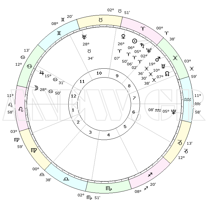 | | ΘΕΣΕΙΣ ΠΛΑΝΗΤΩΝ ΑΣΤΡΟΛΟΓΙΚΟΥ ΧΑΡΤΗ ΤΗΣ ΣΤΙΓΜΗΣ ΑΥΤΗΣ | | | | Πλανήτης | Ζώδιο | Μοίρες | Δεκαήμ. | Σε οίκο | Απόκλιση | | Ακμές των οίκων | | Ηλιος | Κριός | 06°47' | Πρώτο | 9 | 02 N 42 | | 1ος | 26°11' | Καρκίνος | | Σελήνη | Καρκίνος | 28°05' | Τρίτο | 1 | 23 N 53 | | 2ος | 16°60' | Λέων | | Ερμής | Ιχθείς | 10°28' | Δεύτερο | 8 | 08 S 06 | | 3ος | 11°32' | Παρθένος | | Αφροδίτη | Κριός | 26°03' | Τρίτο | 10 | 09 N 28 | | 4ος | 12°04' | Ζυγός | | Αρης | Ιχθείς | 19°34' | Δεύτερο | 9 | 05 S 06 | | 5ος | 18°10' | Σκορπιός | | Δίας | Καρκίνος | 15°31' | Δεύτερο | 12 | 22 N 54 | | 6ος | 24°30' | Τοξότης | | Κρόνος | Κριός | 05°06' | Πρώτο | 9 | 00 N 04 | | 7ος | 26°11' | Αιγόκερως | | Ουρανός | Ταύρος | 28°34' | Τρίτο | 11 | 19 N 40 | | 8ος | 16°60' | Υδροχόος | | Ποσειδώνας | Κριός | 02°02' | Πρώτο | 9 | 00 S 23 | | 9ος | 11°32' | Ιχθείς | | Πλούτωνας | Υδροχόος | 05°08' | Πρώτο | 7 | 22 S 48 | | 10ος | 12°04' | Κριός | | Β. Δεσμός | Ιχθείς | 07°39' | Πρώτο | 8 | 08 S 42 | | 11ος | 18°10' | Ταύρος | | Ωροσκόπος | Καρκίνος | 26°11' | Τρίτο | | | 12ος | 24°30' | Δίδυμοι | | Μεσουράνημα | Κριός | 12°04' | Δεύτερο | | | |