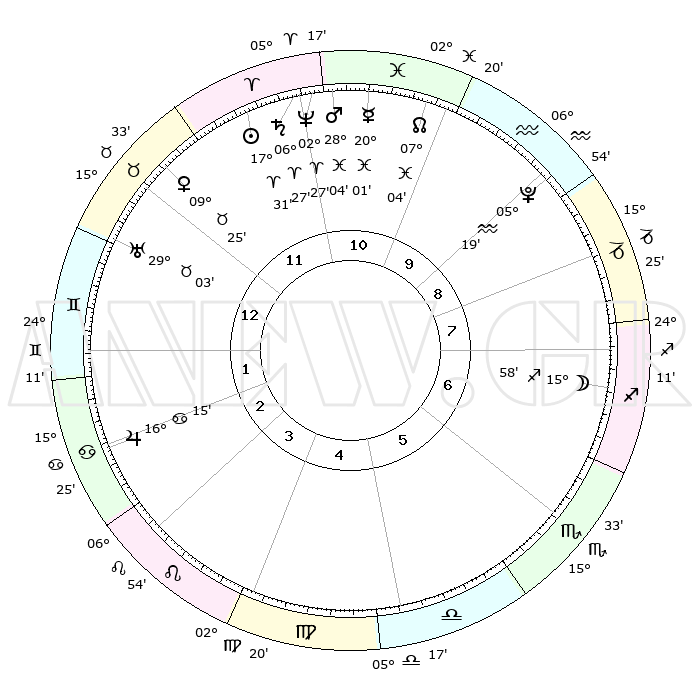 | | ΘΕΣΕΙΣ ΠΛΑΝΗΤΩΝ ΑΣΤΡΟΛΟΓΙΚΟΥ ΧΑΡΤΗ ΤΗΣ ΣΤΙΓΜΗΣ ΑΥΤΗΣ | | | | Πλανήτης | Ζώδιο | Μοίρες | Δεκαήμ. | Σε οίκο | Απόκλιση | | Ακμές των οίκων | | Ηλιος | Κριός | 17°27' | Δεύτερο | 12 | 06 N 51 | | 1ος | 28°36' | Ταύρος | | Σελήνη | Τοξότης | 15°10' | Δεύτερο | 7 | 27 S 42 | | 2ος | 23°42' | Δίδυμοι | | Ερμής | Ιχθείς | 19°57' | Δεύτερο | 11 | 05 S 55 | | 3ος | 15°10' | Καρκίνος | | Αφροδίτη | Ταύρος | 09°20' | Πρώτο | 12 | 14 N 26 | | 4ος | 07°50' | Λέων | | Αρης | Ιχθείς | 28°01' | Τρίτο | 11 | 01 S 44 | | 5ος | 06°03' | Παρθένος | | Δίας | Καρκίνος | 16°15' | Δεύτερο | 3 | 22 N 49 | | 6ος | 14°17' | Ζυγός | | Κρόνος | Κριός | 06°26' | Πρώτο | 11 | 00 N 36 | | 7ος | 28°36' | Σκορπιός | | Ουρανός | Ταύρος | 29°03' | Τρίτο | 1 | 19 N 46 | | 8ος | 23°42' | Τοξότης | | Ποσειδώνας | Κριός | 02°27' | Πρώτο | 11 | 00 S 14 | | 9ος | 15°10' | Αιγόκερως | | Πλούτωνας | Υδροχόος | 05°19' | Πρώτο | 9 | 22 S 47 | | 10ος | 07°50' | Υδροχόος | | Β. Δεσμός | Ιχθείς | 07°04' | Πρώτο | 11 | 08 S 55 | | 11ος | 06°03' | Ιχθείς | | Ωροσκόπος | Ταύρος | 28°36' | Τρίτο | | | 12ος | 14°17' | Κριός | | Μεσουράνημα | Υδροχόος | 07°50' | Πρώτο | | | |
