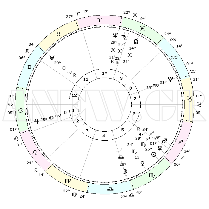 | | ΘΕΣΕΙΣ ΠΛΑΝΗΤΩΝ ΑΣΤΡΟΛΟΓΙΚΟΥ ΧΑΡΤΗ ΤΗΣ ΣΤΙΓΜΗΣ ΑΥΤΗΣ | | | | Πλανήτης | Ζώδιο | Μοίρες | Δεκαήμ. | Σε οίκο | Απόκλιση | | Ακμές των οίκων | | Ηλιος | Σκορπιός | 25°34' | Τρίτο | 6 | 19 S 09 | | 1ος | 13°04' | Δίδυμοι | | Σελήνη | Ζυγός | 27°14' | Τρίτο | 5 | 13 S 35 | | 2ος | 05°36' | Καρκίνος | | Ερμής | Τοξότης | 01°53'R | Πρώτο | 6 | 20 S 54 | | 3ος | 26°49' | Καρκίνος | | Αφροδίτη | Σκορπιός | 13°28' | Δεύτερο | 6 | 14 S 48 | | 4ος | 20°47' | Λέων | | Αρης | Τοξότης | 09°30' | Πρώτο | 6 | 22 S 25 | | 5ος | 21°39' | Παρθένος | | Δίας | Καρκίνος | 25°05'R | Τρίτο | 2 | 21 N 14 | | 6ος | 01°38' | Σκορπιός | | Κρόνος | Ιχθείς | 25°23'R | Τρίτο | 11 | 04 S 03 | | 7ος | 13°04' | Τοξότης | | Ουρανός | Ταύρος | 29°36'R | Τρίτο | 12 | 19 N 51 | | 8ος | 05°36' | Αιγόκερως | | Ποσειδώνας | Ιχθείς | 29°31'R | Τρίτο | 11 | 01 S 26 | | 9ος | 26°49' | Αιγόκερως | | Πλούτωνας | Υδροχόος | 01°39' | Πρώτο | 9 | 23 S 28 | | 10ος | 20°47' | Υδροχόος | | Β. Δεσμός | Ιχθείς | 14°31' | Δεύτερο | 10 | 06 S 06 | | 11ος | 21°39' | Ιχθείς | | Ωροσκόπος | Δίδυμοι | 13°04' | Δεύτερο | | | 12ος | 01°38' | Ταύρος | | Μεσουράνημα | Υδροχόος | 20°47' | Τρίτο | | | |
