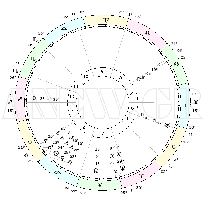 | | ΘΕΣΕΙΣ ΠΛΑΝΗΤΩΝ ΑΣΤΡΟΛΟΓΙΚΟΥ ΧΑΡΤΗ ΤΗΣ ΣΤΙΓΜΗΣ ΑΥΤΗΣ | | | | Πλανήτης | Ζώδιο | Μοίρες | Δεκαήμ. | Σε οίκο | Απόκλιση | | Ακμές των οίκων | | Ηλιος | Αιγόκερως | 24°53' | Τρίτο | 2 | 21 S 09 | | 1ος | 24°21' | Σκορπιός | | Σελήνη | Τοξότης | 12°43' | Δεύτερο | 1 | 27 S 24 | | 2ος | 24°46' | Τοξότης | | Ερμής | Αιγόκερως | 20°44' | Τρίτο | 2 | 23 S 36 | | 3ος | 29°34' | Αιγόκερως | | Αφροδίτη | Αιγόκερως | 26°54' | Τρίτο | 2 | 21 S 44 | | 4ος | 05°25' | Ιχθείς | | Αρης | Αιγόκερως | 23°32' | Τρίτο | 2 | 22 S 20 | | 5ος | 07°05' | Κριός | | Δίας | Καρκίνος | 19°28'R | Δεύτερο | 8 | 22 N 17 | | 6ος | 02°54' | Ταύρος | | Κρόνος | Ιχθείς | 27°15' | Τρίτο | 4 | 03 S 08 | | 7ος | 24°21' | Ταύρος | | Ουρανός | Ταύρος | 27°38'R | Τρίτο | 7 | 19 N 26 | | 8ος | 24°46' | Δίδυμοι | | Ποσειδώνας | Ιχθείς | 29°44' | Τρίτο | 4 | 01 S 19 | | 9ος | 29°34' | Καρκίνος | | Πλούτωνας | Υδροχόος | 03°10' | Πρώτο | 3 | 23 S 08 | | 10ος | 05°25' | Παρθένος | | Β. Δεσμός | Ιχθείς | 11°26' | Δεύτερο | 4 | 07 S 17 | | 11ος | 07°05' | Ζυγός | | Ωροσκόπος | Σκορπιός | 24°21' | Τρίτο | | | 12ος | 02°54' | Σκορπιός | | Μεσουράνημα | Παρθένος | 05°25' | Πρώτο | | | |