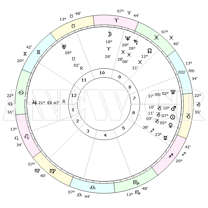 | | ΘΕΣΕΙΣ ΠΛΑΝΗΤΩΝ ΑΣΤΡΟΛΟΓΙΚΟΥ ΧΑΡΤΗ ΤΗΣ ΣΤΙΓΜΗΣ ΑΥΤΗΣ | | | | Πλανήτης | Ζώδιο | Μοίρες | Δεκαήμ. | Σε οίκο | Απόκλιση | | Ακμές των οίκων | | Ηλιος | Αιγόκερως | 07°07' | Πρώτο | 7 | 23 S 15 | | 1ος | 29°06' | Δίδυμοι | | Σελήνη | Κριός | 17°25' | Δεύτερο | 11 | 09 N 37 | | 2ος | 19°56' | Καρκίνος | | Ερμής | Τοξότης | 23°31' | Τρίτο | 6 | 23 S 27 | | 3ος | 11°41' | Λέων | | Αφροδίτη | Αιγόκερως | 04°57' | Πρώτο | 7 | 23 S 43 | | 4ος | 07°51' | Παρθένος | | Αρης | Αιγόκερως | 10°06' | Δεύτερο | 7 | 23 S 55 | | 5ος | 11°39' | Ζυγός | | Δίας | Καρκίνος | 21°47'R | Τρίτο | 2 | 21 N 54 | | 6ος | 21°43' | Σκορπιός | | Κρόνος | Ιχθείς | 26°06' | Τρίτο | 10 | 03 S 38 | | 7ος | 29°06' | Τοξότης | | Ουρανός | Ταύρος | 28°02'R | Τρίτο | 12 | 19 N 31 | | 8ος | 19°56' | Αιγόκερως | | Ποσειδώνας | Ιχθείς | 29°28' | Τρίτο | 10 | 01 S 26 | | 9ος | 11°41' | Υδροχόος | | Πλούτωνας | Υδροχόος | 02°37' | Πρώτο | 8 | 23 S 14 | | 10ος | 07°51' | Ιχθείς | | Β. Δεσμός | Ιχθείς | 12°21' | Δεύτερο | 10 | 06 S 56 | | 11ος | 11°39' | Κριός | | Ωροσκόπος | Δίδυμοι | 29°06' | Τρίτο | | | 12ος | 21°43' | Ταύρος | | Μεσουράνημα | Ιχθείς | 07°51' | Πρώτο | | | |