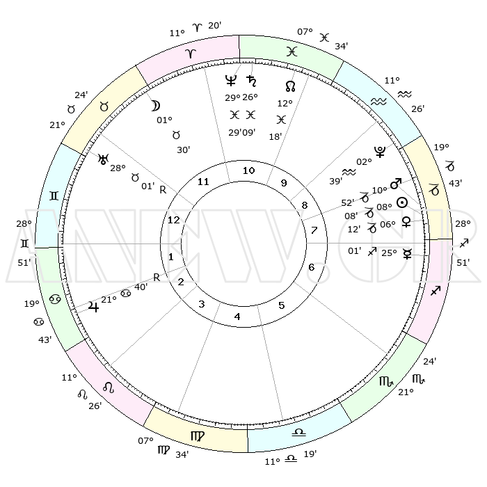 | | ΘΕΣΕΙΣ ΠΛΑΝΗΤΩΝ ΑΣΤΡΟΛΟΓΙΚΟΥ ΧΑΡΤΗ ΤΗΣ ΣΤΙΓΜΗΣ ΑΥΤΗΣ | | | | Πλανήτης | Ζώδιο | Μοίρες | Δεκαήμ. | Σε οίκο | Απόκλιση | | Ακμές των οίκων | | Ηλιος | Αιγόκερως | 08°03' | Πρώτο | 8 | 23 S 11 | | 1ος | 02°56' | Δίδυμοι | | Σελήνη | Ταύρος | 00°30' | Πρώτο | 12 | 15 N 15 | | 2ος | 27°10' | Δίδυμοι | | Ερμής | Τοξότης | 24°55' | Τρίτο | 7 | 23 S 38 | | 3ος | 18°30' | Καρκίνος | | Αφροδίτη | Αιγόκερως | 06°07' | Πρώτο | 8 | 23 S 42 | | 4ος | 11°29' | Λέων | | Αρης | Αιγόκερως | 10°49' | Δεύτερο | 8 | 23 S 52 | | 5ος | 10°28' | Παρθένος | | Δίας | Καρκίνος | 21°40'R | Τρίτο | 3 | 21 N 55 | | 6ος | 19°21' | Ζυγός | | Κρόνος | Ιχθείς | 26°09' | Τρίτο | 11 | 03 S 37 | | 7ος | 02°56' | Τοξότης | | Ουρανός | Ταύρος | 28°01'R | Τρίτο | 12 | 19 N 31 | | 8ος | 27°10' | Τοξότης | | Ποσειδώνας | Ιχθείς | 29°29' | Τρίτο | 11 | 01 S 26 | | 9ος | 18°30' | Αιγόκερως | | Πλούτωνας | Υδροχόος | 02°39' | Πρώτο | 9 | 23 S 14 | | 10ος | 11°29' | Υδροχόος | | Β. Δεσμός | Ιχθείς | 12°18' | Δεύτερο | 11 | 06 S 57 | | 11ος | 10°28' | Ιχθείς | | Ωροσκόπος | Δίδυμοι | 02°56' | Πρώτο | | | 12ος | 19°21' | Κριός | | Μεσουράνημα | Υδροχόος | 11°29' | Δεύτερο | | | |