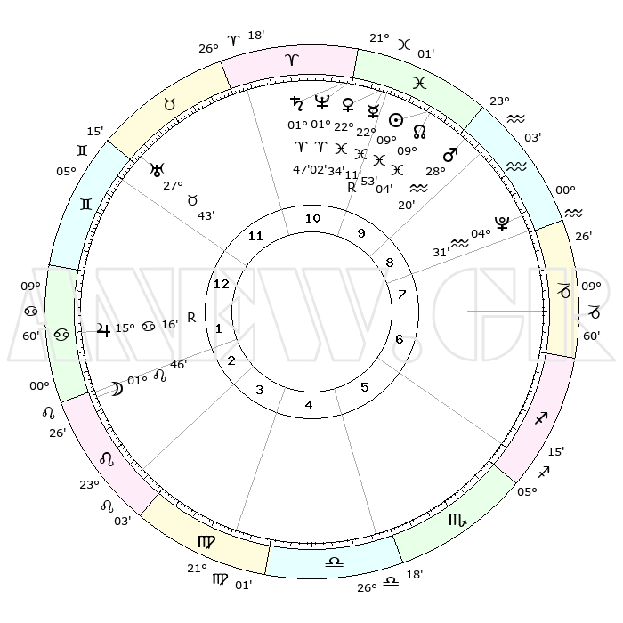 | | ΘΕΣΕΙΣ ΠΛΑΝΗΤΩΝ ΑΣΤΡΟΛΟΓΙΚΟΥ ΧΑΡΤΗ ΤΗΣ ΣΤΙΓΜΗΣ ΑΥΤΗΣ | | | | Πλανήτης | Ζώδιο | Μοίρες | Δεκαήμ. | Σε οίκο | Απόκλιση | | Ακμές των οίκων | | Ηλιος | Ιχθείς | 09°49' | Πρώτο | 10 | 07 S 53 | | 1ος | 21°25' | Δίδυμοι | | Σελήνη | Λέων | 00°59' | Πρώτο | 2 | 23 N 07 | | 2ος | 12°55' | Καρκίνος | | Ερμής | Ιχθείς | 22°12'R | Τρίτο | 10 | 00 S 09 | | 3ος | 04°18' | Λέων | | Αφροδίτη | Ιχθείς | 22°30' | Τρίτο | 10 | 04 S 14 | | 4ος | 29°20' | Λέων | | Αρης | Υδροχόος | 28°18' | Τρίτο | 9 | 13 S 05 | | 5ος | 01°47' | Ζυγός | | Δίας | Καρκίνος | 15°16'R | Δεύτερο | 2 | 22 N 54 | | 6ος | 12°05' | Σκορπιός | | Κρόνος | Κριός | 01°46' | Πρώτο | 10 | 01 S 15 | | 7ος | 21°26' | Τοξότης | | Ουρανός | Ταύρος | 27°43' | Τρίτο | 12 | 19 N 28 | | 8ος | 12°55' | Αιγόκερως | | Ποσειδώνας | Κριός | 01°02' | Πρώτο | 10 | 00 S 47 | | 9ος | 04°18' | Υδροχόος | | Πλούτωνας | Υδροχόος | 04°31' | Πρώτο | 9 | 22 S 53 | | 10ος | 29°20' | Υδροχόος | | Β. Δεσμός | Ιχθείς | 09°05' | Πρώτο | 10 | 08 S 10 | | 11ος | 01°47' | Κριός | | Ωροσκόπος | Δίδυμοι | 21°25' | Τρίτο | | | 12ος | 12°05' | Ταύρος | | Μεσουράνημα | Υδροχόος | 29°20' | Τρίτο | | | |
