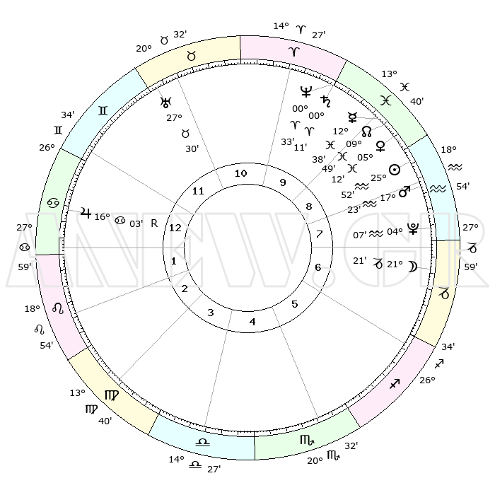 | | ΘΕΣΕΙΣ ΠΛΑΝΗΤΩΝ ΑΣΤΡΟΛΟΓΙΚΟΥ ΧΑΡΤΗ ΤΗΣ ΣΤΙΓΜΗΣ ΑΥΤΗΣ | | | | Πλανήτης | Ζώδιο | Μοίρες | Δεκαήμ. | Σε οίκο | Απόκλιση | | Ακμές των οίκων | | Ηλιος | Υδροχόος | 25°48' | Τρίτο | 9 | 12 S 55 | | 1ος | 06°29' | Καρκίνος | | Σελήνη | Αιγόκερως | 20°28' | Τρίτο | 7 | 25 S 47 | | 2ος | 26°60' | Καρκίνος | | Ερμής | Ιχθείς | 12°32' | Δεύτερο | 9 | 06 S 55 | | 3ος | 19°17' | Λέων | | Αφροδίτη | Ιχθείς | 05°06' | Πρώτο | 9 | 11 S 00 | | 4ος | 16°40' | Παρθένος | | Αρης | Υδροχόος | 17°20' | Δεύτερο | 8 | 16 S 40 | | 5ος | 21°32' | Ζυγός | | Δίας | Καρκίνος | 16°04'R | Δεύτερο | 1 | 22 N 47 | | 6ος | 00°55' | Τοξότης | | Κρόνος | Κριός | 00°10' | Πρώτο | 10 | 01 S 54 | | 7ος | 06°29' | Αιγόκερως | | Ουρανός | Ταύρος | 27°30' | Τρίτο | 11 | 19 N 25 | | 8ος | 26°60' | Αιγόκερως | | Ποσειδώνας | Κριός | 00°33' | Πρώτο | 10 | 00 S 59 | | 9ος | 19°17' | Υδροχόος | | Πλούτωνας | Υδροχόος | 04°07' | Πρώτο | 8 | 22 S 57 | | 10ος | 16°40' | Ιχθείς | | Β. Δεσμός | Ιχθείς | 09°49' | Πρώτο | 9 | 07 S 53 | | 11ος | 21°32' | Κριός | | Ωροσκόπος | Καρκίνος | 06°29' | Πρώτο | | | 12ος | 00°55' | Δίδυμοι | | Μεσουράνημα | Ιχθείς | 16°40' | Δεύτερο | | | |