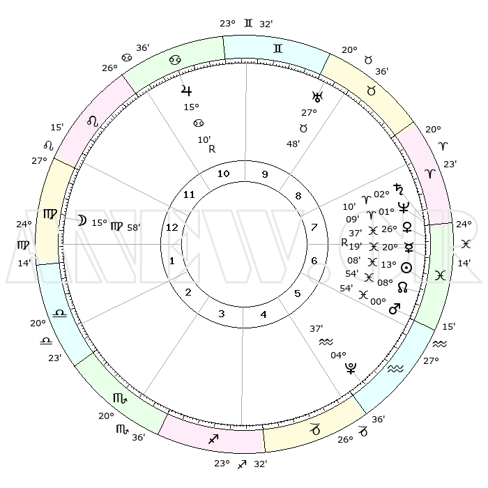 | | ΘΕΣΕΙΣ ΠΛΑΝΗΤΩΝ ΑΣΤΡΟΛΟΓΙΚΟΥ ΧΑΡΤΗ ΤΗΣ ΣΤΙΓΜΗΣ ΑΥΤΗΣ | | | | Πλανήτης | Ζώδιο | Μοίρες | Δεκαήμ. | Σε οίκο | Απόκλιση | | Ακμές των οίκων | | Ηλιος | Ιχθείς | 13°05' | Δεύτερο | 7 | 06 S 39 | | 1ος | 07°55' | Παρθένος | | Σελήνη | Παρθένος | 15°14' | Δεύτερο | 1 | 05 N 17 | | 2ος | 02°35' | Ζυγός | | Ερμής | Ιχθείς | 20°21'R | Τρίτο | 7 | 00 S 30 | | 3ος | 01°54' | Σκορπιός | | Αφροδίτη | Ιχθείς | 26°32' | Τρίτο | 7 | 02 S 35 | | 4ος | 04°51' | Τοξότης | | Αρης | Ιχθείς | 00°51' | Πρώτο | 6 | 12 S 12 | | 5ος | 08°33' | Αιγόκερως | | Δίας | Καρκίνος | 15°11'R | Δεύτερο | 11 | 22 N 55 | | 6ος | 09°58' | Υδροχόος | | Κρόνος | Κριός | 02°09' | Πρώτο | 7 | 01 S 06 | | 7ος | 07°55' | Ιχθείς | | Ουρανός | Ταύρος | 27°48' | Τρίτο | 9 | 19 N 29 | | 8ος | 02°35' | Κριός | | Ποσειδώνας | Κριός | 01°09' | Πρώτο | 7 | 00 S 45 | | 9ος | 01°54' | Ταύρος | | Πλούτωνας | Υδροχόος | 04°36' | Πρώτο | 5 | 22 S 52 | | 10ος | 04°51' | Δίδυμοι | | Β. Δεσμός | Ιχθείς | 08°54' | Πρώτο | 7 | 08 S 14 | | 11ος | 08°33' | Καρκίνος | | Ωροσκόπος | Παρθένος | 07°55' | Πρώτο | | | 12ος | 09°58' | Λέων | | Μεσουράνημα | Δίδυμοι | 04°51' | Πρώτο | | | |
