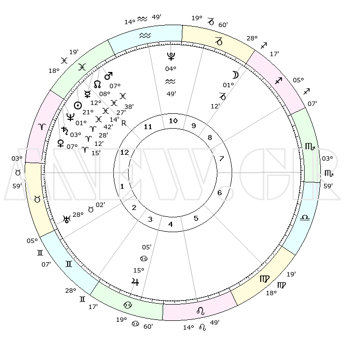 | | ΘΕΣΕΙΣ ΠΛΑΝΗΤΩΝ ΑΣΤΡΟΛΟΓΙΚΟΥ ΧΑΡΤΗ ΤΗΣ ΣΤΙΓΜΗΣ ΑΥΤΗΣ | | | | Πλανήτης | Ζώδιο | Μοίρες | Δεκαήμ. | Σε οίκο | Απόκλιση | | Ακμές των οίκων | | Ηλιος | Ιχθείς | 21°38' | Τρίτο | 12 | 03 S 19 | | 1ος | 00°32' | Κριός | | Σελήνη | Αιγόκερως | 00°30' | Πρώτο | 10 | 28 S 20 | | 2ος | 10°42' | Ταύρος | | Ερμής | Ιχθείς | 12°17'R | Δεύτερο | 12 | 04 S 10 | | 3ος | 08°01' | Δίδυμοι | | Αφροδίτη | Κριός | 07°11' | Πρώτο | 1 | 01 N 49 | | 4ος | 00°18' | Καρκίνος | | Αρης | Ιχθείς | 07°35' | Πρώτο | 12 | 09 S 44 | | 5ος | 22°38' | Καρκίνος | | Δίας | Καρκίνος | 15°05' | Δεύτερο | 4 | 22 N 56 | | 6ος | 20°07' | Λέων | | Κρόνος | Κριός | 03°12' | Πρώτο | 1 | 00 S 41 | | 7ος | 00°32' | Ζυγός | | Ουρανός | Ταύρος | 28°01' | Τρίτο | 2 | 19 N 33 | | 8ος | 10°42' | Σκορπιός | | Ποσειδώνας | Κριός | 01°28' | Πρώτο | 1 | 00 S 37 | | 9ος | 08°01' | Τοξότης | | Πλούτωνας | Υδροχόος | 04°49' | Πρώτο | 11 | 22 S 50 | | 10ος | 00°18' | Αιγόκερως | | Β. Δεσμός | Ιχθείς | 08°27' | Πρώτο | 12 | 08 S 24 | | 11ος | 22°38' | Αιγόκερως | | Ωροσκόπος | Κριός | 00°32' | Πρώτο | | | 12ος | 20°07' | Υδροχόος | | Μεσουράνημα | Αιγόκερως | 00°18' | Πρώτο | | | |