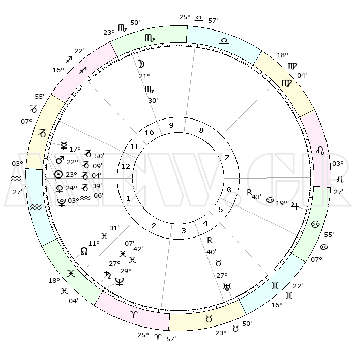 | | ΘΕΣΕΙΣ ΠΛΑΝΗΤΩΝ ΑΣΤΡΟΛΟΓΙΚΟΥ ΧΑΡΤΗ ΤΗΣ ΣΤΙΓΜΗΣ ΑΥΤΗΣ | | | | Πλανήτης | Ζώδιο | Μοίρες | Δεκαήμ. | Σε οίκο | Απόκλιση | | Ακμές των οίκων | | Ηλιος | Αιγόκερως | 22°59' | Τρίτο | 1 | 21 S 29 | | 1ος | 28°59' | Τοξότης | | Σελήνη | Σκορπιός | 20°25' | Τρίτο | 11 | 22 S 29 | | 2ος | 05°52' | Υδροχόος | | Ερμής | Αιγόκερως | 17°42' | Δεύτερο | 1 | 23 S 55 | | 3ος | 15°48' | Ιχθείς | | Αφροδίτη | Αιγόκερως | 24°32' | Τρίτο | 1 | 22 S 07 | | 4ος | 19°54' | Κριός | | Αρης | Αιγόκερως | 22°04' | Τρίτο | 1 | 22 S 34 | | 5ος | 16°23' | Ταύρος | | Δίας | Καρκίνος | 19°43'R | Δεύτερο | 7 | 22 N 15 | | 6ος | 08°15' | Δίδυμοι | | Κρόνος | Ιχθείς | 27°06' | Τρίτο | 3 | 03 S 11 | | 7ος | 28°59' | Δίδυμοι | | Ουρανός | Ταύρος | 27°40'R | Τρίτο | 5 | 19 N 27 | | 8ος | 05°52' | Λέων | | Ποσειδώνας | Ιχθείς | 29°42' | Τρίτο | 3 | 01 S 20 | | 9ος | 15°48' | Παρθένος | | Πλούτωνας | Υδροχόος | 03°06' | Πρώτο | 1 | 23 S 08 | | 10ος | 19°54' | Ζυγός | | Β. Δεσμός | Ιχθείς | 11°31' | Δεύτερο | 2 | 07 S 14 | | 11ος | 16°23' | Σκορπιός | | Ωροσκόπος | Τοξότης | 28°59' | Τρίτο | | | 12ος | 08°15' | Τοξότης | | Μεσουράνημα | Ζυγός | 19°54' | Δεύτερο | | | |