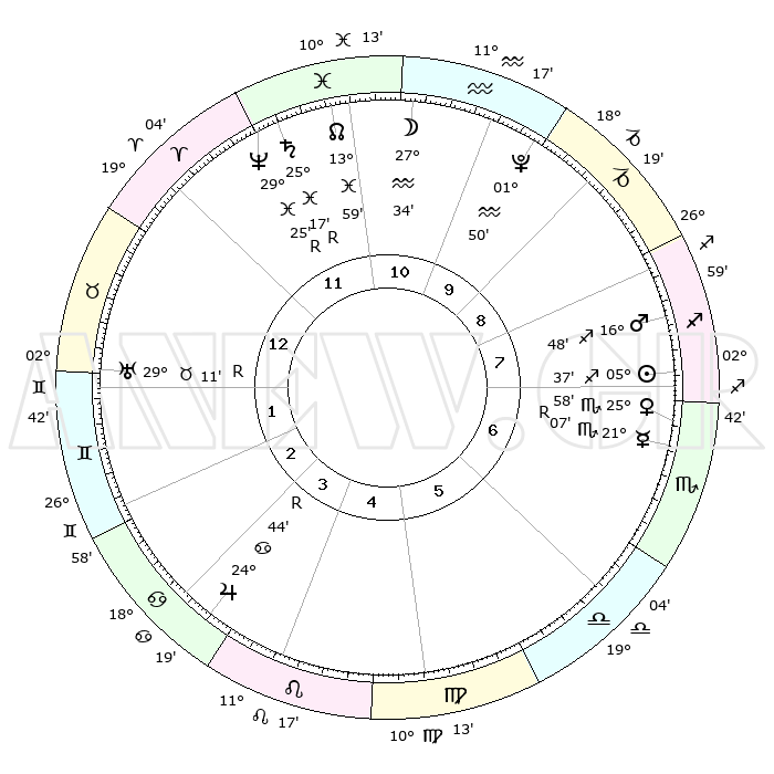 | | ΘΕΣΕΙΣ ΠΛΑΝΗΤΩΝ ΑΣΤΡΟΛΟΓΙΚΟΥ ΧΑΡΤΗ ΤΗΣ ΣΤΙΓΜΗΣ ΑΥΤΗΣ | | | | Πλανήτης | Ζώδιο | Μοίρες | Δεκαήμ. | Σε οίκο | Απόκλιση | | Ακμές των οίκων | | Ηλιος | Τοξότης | 05°35' | Πρώτο | 7 | 21 S 14 | | 1ος | 20°12' | Ταύρος | | Σελήνη | Υδροχόος | 27°12' | Τρίτο | 10 | 13 S 50 | | 2ος | 17°10' | Δίδυμοι | | Ερμής | Σκορπιός | 21°08'R | Τρίτο | 7 | 15 S 47 | | 3ος | 09°03' | Καρκίνος | | Αφροδίτη | Σκορπιός | 25°56' | Τρίτο | 7 | 18 S 26 | | 4ος | 01°14' | Λέων | | Αρης | Τοξότης | 16°47' | Δεύτερο | 7 | 23 S 24 | | 5ος | 28°07' | Λέων | | Δίας | Καρκίνος | 24°44'R | Τρίτο | 3 | 21 N 19 | | 6ος | 04°51' | Ζυγός | | Κρόνος | Ιχθείς | 25°17'R | Τρίτο | 11 | 04 S 04 | | 7ος | 20°12' | Σκορπιός | | Ουρανός | Ταύρος | 29°11'R | Τρίτο | 1 | 19 N 46 | | 8ος | 17°10' | Τοξότης | | Ποσειδώνας | Ιχθείς | 29°25'R | Τρίτο | 11 | 01 S 28 | | 9ος | 09°03' | Αιγόκερως | | Πλούτωνας | Υδροχόος | 01°50' | Πρώτο | 10 | 23 S 25 | | 10ος | 01°14' | Υδροχόος | | Β. Δεσμός | Ιχθείς | 13°59' | Δεύτερο | 11 | 06 S 18 | | 11ος | 28°07' | Υδροχόος | | Ωροσκόπος | Ταύρος | 20°12' | Τρίτο | | | 12ος | 04°51' | Κριός | | Μεσουράνημα | Υδροχόος | 01°14' | Πρώτο | | | |
