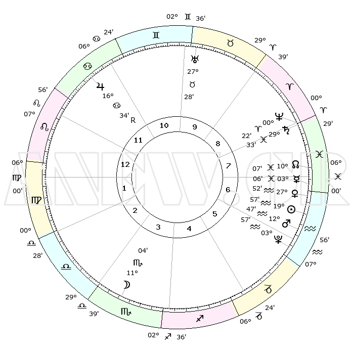 | | ΘΕΣΕΙΣ ΠΛΑΝΗΤΩΝ ΑΣΤΡΟΛΟΓΙΚΟΥ ΧΑΡΤΗ ΤΗΣ ΣΤΙΓΜΗΣ ΑΥΤΗΣ | | | | Πλανήτης | Ζώδιο | Μοίρες | Δεκαήμ. | Σε οίκο | Απόκλιση | | Ακμές των οίκων | | Ηλιος | Υδροχόος | 19°53' | Δεύτερο | 7 | 14 S 51 | | 1ος | 18°02' | Λέων | | Σελήνη | Σκορπιός | 10°19' | Δεύτερο | 3 | 19 S 17 | | 2ος | 10°39' | Παρθένος | | Ερμής | Ιχθείς | 02°59' | Πρώτο | 7 | 11 S 26 | | 3ος | 08°03' | Ζυγός | | Αφροδίτη | Υδροχόος | 27°47' | Τρίτο | 7 | 13 S 36 | | 4ος | 10°38' | Σκορπιός | | Αρης | Υδροχόος | 12°44' | Δεύτερο | 6 | 18 S 00 | | 5ος | 15°42' | Τοξότης | | Δίας | Καρκίνος | 16°34'R | Δεύτερο | 11 | 22 N 43 | | 6ος | 18°49' | Αιγόκερως | | Κρόνος | Ιχθείς | 29°32' | Τρίτο | 8 | 02 S 10 | | 7ος | 18°02' | Υδροχόος | | Ουρανός | Ταύρος | 27°28' | Τρίτο | 10 | 19 N 24 | | 8ος | 10°39' | Ιχθείς | | Ποσειδώνας | Κριός | 00°22' | Πρώτο | 8 | 01 S 03 | | 9ος | 08°03' | Κριός | | Πλούτωνας | Υδροχόος | 03°57' | Πρώτο | 6 | 22 S 59 | | 10ος | 10°38' | Ταύρος | | Β. Δεσμός | Ιχθείς | 10°07' | Δεύτερο | 7 | 07 S 46 | | 11ος | 15°42' | Δίδυμοι | | Ωροσκόπος | Λέων | 18°02' | Δεύτερο | | | 12ος | 18°49' | Καρκίνος | | Μεσουράνημα | Ταύρος | 10°38' | Δεύτερο | | | |