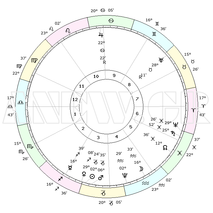 | | ΘΕΣΕΙΣ ΠΛΑΝΗΤΩΝ ΑΣΤΡΟΛΟΓΙΚΟΥ ΧΑΡΤΗ ΤΗΣ ΣΤΙΓΜΗΣ ΑΥΤΗΣ | | | | Πλανήτης | Ζώδιο | Μοίρες | Δεκαήμ. | Σε οίκο | Απόκλιση | | Ακμές των οίκων | | Ηλιος | Αιγόκερως | 02°20' | Πρώτο | 4 | 23 S 25 | | 1ος | 26°15' | Παρθένος | | Σελήνη | Υδροχόος | 15°37' | Δεύτερο | 5 | 18 S 15 | | 2ος | 22°33' | Ζυγός | | Ερμής | Τοξότης | 16°32' | Δεύτερο | 3 | 22 S 22 | | 3ος | 22°50' | Σκορπιός | | Αφροδίτη | Τοξότης | 29°03' | Τρίτο | 4 | 23 S 37 | | 4ος | 25°47' | Τοξότης | | Αρης | Αιγόκερως | 06°31' | Πρώτο | 4 | 24 S 07 | | 5ος | 28°49' | Αιγόκερως | | Δίας | Καρκίνος | 22°22'R | Τρίτο | 10 | 21 N 48 | | 6ος | 29°23' | Υδροχόος | | Κρόνος | Ιχθείς | 25°52' | Τρίτο | 6 | 03 S 45 | | 7ος | 26°15' | Ιχθείς | | Ουρανός | Ταύρος | 28°11'R | Τρίτο | 9 | 19 N 33 | | 8ος | 22°33' | Κριός | | Ποσειδώνας | Ιχθείς | 29°26' | Τρίτο | 7 | 01 S 27 | | 9ος | 22°50' | Ταύρος | | Πλούτωνας | Υδροχόος | 02°29' | Πρώτο | 5 | 23 S 16 | | 10ος | 25°47' | Δίδυμοι | | Β. Δεσμός | Ιχθείς | 12°36' | Δεύτερο | 6 | 06 S 50 | | 11ος | 28°49' | Καρκίνος | | Ωροσκόπος | Παρθένος | 26°15' | Τρίτο | | | 12ος | 29°23' | Λέων | | Μεσουράνημα | Δίδυμοι | 25°47' | Τρίτο | | | |