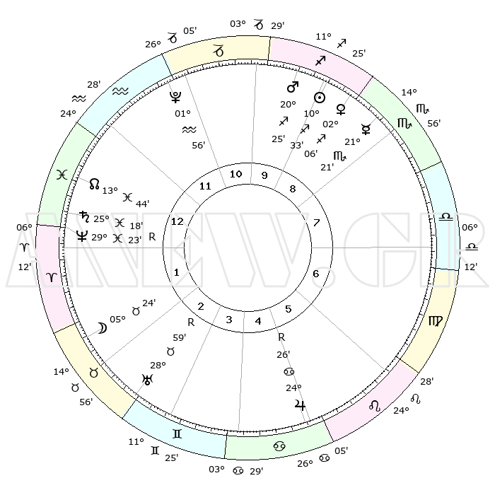 | | ΘΕΣΕΙΣ ΠΛΑΝΗΤΩΝ ΑΣΤΡΟΛΟΓΙΚΟΥ ΧΑΡΤΗ ΤΗΣ ΣΤΙΓΜΗΣ ΑΥΤΗΣ | | | | Πλανήτης | Ζώδιο | Μοίρες | Δεκαήμ. | Σε οίκο | Απόκλιση | | Ακμές των οίκων | | Ηλιος | Τοξότης | 10°31' | Δεύτερο | 9 | 22 S 01 | | 1ος | 16°36' | Ιχθείς | | Σελήνη | Ταύρος | 04°54' | Πρώτο | 2 | 16 N 48 | | 2ος | 29°47' | Κριός | | Ερμής | Σκορπιός | 21°20' | Τρίτο | 8 | 15 S 34 | | 3ος | 29°23' | Ταύρος | | Αφροδίτη | Τοξότης | 02°03' | Πρώτο | 9 | 19 S 56 | | 4ος | 22°26' | Δίδυμοι | | Αρης | Τοξότης | 20°23' | Τρίτο | 9 | 23 S 45 | | 5ος | 14°17' | Καρκίνος | | Δίας | Καρκίνος | 24°26'R | Τρίτο | 5 | 21 N 23 | | 6ος | 09°47' | Λέων | | Κρόνος | Ιχθείς | 25°18' | Τρίτο | 1 | 04 S 02 | | 7ος | 16°36' | Παρθένος | | Ουρανός | Ταύρος | 28°59'R | Τρίτο | 2 | 19 N 44 | | 8ος | 29°47' | Ζυγός | | Ποσειδώνας | Ιχθείς | 29°23'R | Τρίτο | 1 | 01 S 29 | | 9ος | 29°23' | Σκορπιός | | Πλούτωνας | Υδροχόος | 01°56' | Πρώτο | 11 | 23 S 24 | | 10ος | 22°26' | Τοξότης | | Β. Δεσμός | Ιχθείς | 13°44' | Δεύτερο | 12 | 06 S 24 | | 11ος | 14°17' | Αιγόκερως | | Ωροσκόπος | Ιχθείς | 16°36' | Δεύτερο | | | 12ος | 09°47' | Υδροχόος | | Μεσουράνημα | Τοξότης | 22°26' | Τρίτο | | | |