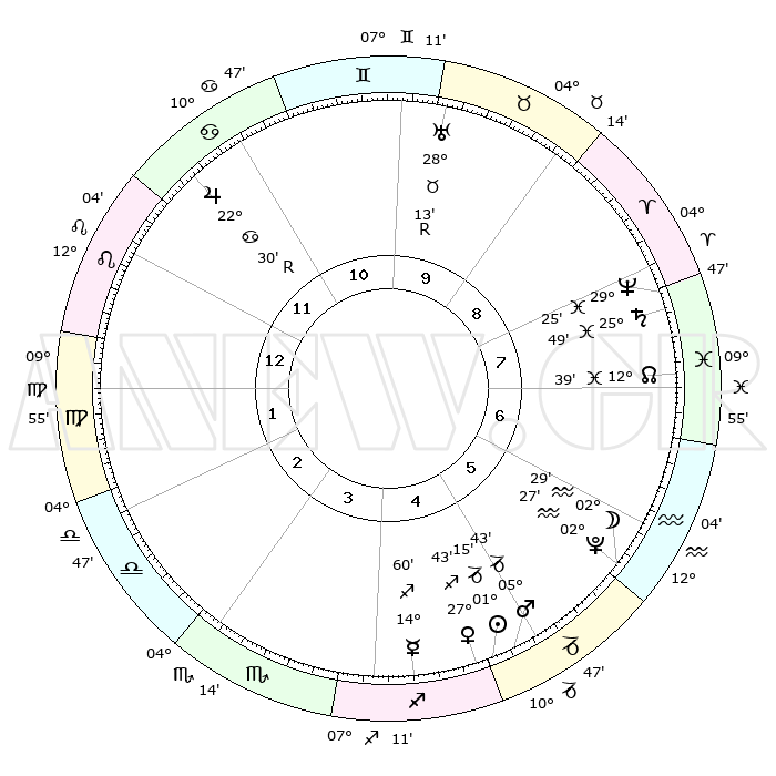 | | ΘΕΣΕΙΣ ΠΛΑΝΗΤΩΝ ΑΣΤΡΟΛΟΓΙΚΟΥ ΧΑΡΤΗ ΤΗΣ ΣΤΙΓΜΗΣ ΑΥΤΗΣ | | | | Πλανήτης | Ζώδιο | Μοίρες | Δεκαήμ. | Σε οίκο | Απόκλιση | | Ακμές των οίκων | | Ηλιος | Αιγόκερως | 01°11' | Πρώτο | 5 | 23 S 26 | | 1ος | 19°06' | Λέων | | Σελήνη | Υδροχόος | 01°36' | Πρώτο | 6 | 22 S 57 | | 2ος | 11°49' | Παρθένος | | Ερμής | Τοξότης | 14°53' | Δεύτερο | 4 | 22 S 03 | | 3ος | 09°21' | Ζυγός | | Αφροδίτη | Τοξότης | 27°38' | Τρίτο | 5 | 23 S 34 | | 4ος | 11°59' | Σκορπιός | | Αρης | Αιγόκερως | 05°40' | Πρώτο | 5 | 24 S 08 | | 5ος | 16°58' | Τοξότης | | Δίας | Καρκίνος | 22°30'R | Τρίτο | 12 | 21 N 46 | | 6ος | 19°57' | Αιγόκερως | | Κρόνος | Ιχθείς | 25°49' | Τρίτο | 8 | 03 S 46 | | 7ος | 19°06' | Υδροχόος | | Ουρανός | Ταύρος | 28°13'R | Τρίτο | 10 | 19 N 34 | | 8ος | 11°49' | Ιχθείς | | Ποσειδώνας | Ιχθείς | 29°25' | Τρίτο | 8 | 01 S 28 | | 9ος | 09°21' | Κριός | | Πλούτωνας | Υδροχόος | 02°27' | Πρώτο | 6 | 23 S 17 | | 10ος | 11°59' | Ταύρος | | Β. Δεσμός | Ιχθείς | 12°39' | Δεύτερο | 8 | 06 S 48 | | 11ος | 16°58' | Δίδυμοι | | Ωροσκόπος | Λέων | 19°06' | Δεύτερο | | | 12ος | 19°57' | Καρκίνος | | Μεσουράνημα | Ταύρος | 11°59' | Δεύτερο | | | |