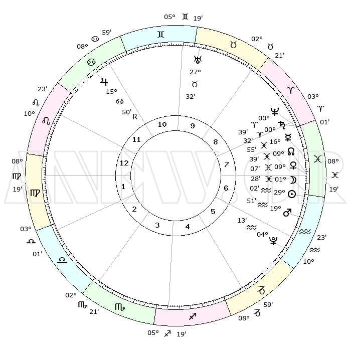 | | ΘΕΣΕΙΣ ΠΛΑΝΗΤΩΝ ΑΣΤΡΟΛΟΓΙΚΟΥ ΧΑΡΤΗ ΤΗΣ ΣΤΙΓΜΗΣ ΑΥΤΗΣ | | | | Πλανήτης | Ζώδιο | Μοίρες | Δεκαήμ. | Σε οίκο | Απόκλιση | | Ακμές των οίκων | | Ηλιος | Υδροχόος | 28°58' | Τρίτο | 7 | 11 S 50 | | 1ος | 20°20' | Λέων | | Σελήνη | Ιχθείς | 00°39' | Πρώτο | 7 | 11 S 57 | | 2ος | 13°10' | Παρθένος | | Ερμής | Ιχθείς | 16°50' | Δεύτερο | 8 | 04 S 35 | | 3ος | 10°51' | Ζυγός | | Αφροδίτη | Ιχθείς | 09°02' | Πρώτο | 7 | 09 S 32 | | 4ος | 13°32' | Σκορπιός | | Αρης | Υδροχόος | 19°48' | Δεύτερο | 6 | 15 S 54 | | 5ος | 18°25' | Τοξότης | | Δίας | Καρκίνος | 15°50'R | Δεύτερο | 11 | 22 N 49 | | 6ος | 21°17' | Αιγόκερως | | Κρόνος | Κριός | 00°31' | Πρώτο | 8 | 01 S 46 | | 7ος | 20°20' | Υδροχόος | | Ουρανός | Ταύρος | 27°32' | Τρίτο | 10 | 19 N 26 | | 8ος | 13°10' | Ιχθείς | | Ποσειδώνας | Κριός | 00°39' | Πρώτο | 8 | 00 S 56 | | 9ος | 10°51' | Κριός | | Πλούτωνας | Υδροχόος | 04°13' | Πρώτο | 6 | 22 S 56 | | 10ος | 13°32' | Ταύρος | | Β. Δεσμός | Ιχθείς | 09°39' | Πρώτο | 7 | 07 S 57 | | 11ος | 18°25' | Δίδυμοι | | Ωροσκόπος | Λέων | 20°20' | Τρίτο | | | 12ος | 21°17' | Καρκίνος | | Μεσουράνημα | Ταύρος | 13°32' | Δεύτερο | | | |
