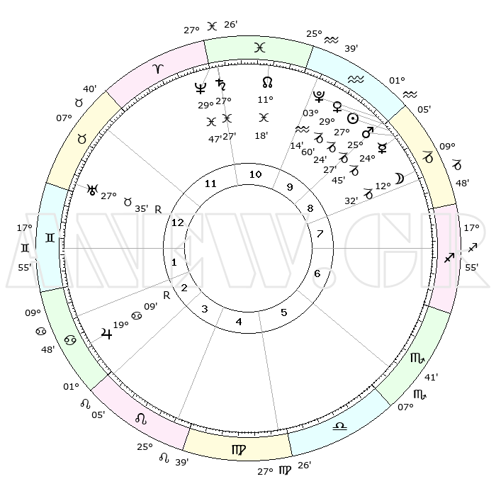 | | ΘΕΣΕΙΣ ΠΛΑΝΗΤΩΝ ΑΣΤΡΟΛΟΓΙΚΟΥ ΧΑΡΤΗ ΤΗΣ ΣΤΙΓΜΗΣ ΑΥΤΗΣ | | | | Πλανήτης | Ζώδιο | Μοίρες | Δεκαήμ. | Σε οίκο | Απόκλιση | | Ακμές των οίκων | | Ηλιος | Αιγόκερως | 27°20' | Τρίτο | 9 | 20 S 41 | | 1ος | 19°43' | Ταύρος | | Σελήνη | Αιγόκερως | 11°42' | Δεύτερο | 9 | 27 S 16 | | 2ος | 16°48' | Δίδυμοι | | Ερμής | Αιγόκερως | 24°39' | Τρίτο | 9 | 23 S 04 | | 3ος | 08°43' | Καρκίνος | | Αφροδίτη | Αιγόκερως | 29°55' | Τρίτο | 9 | 21 S 11 | | 4ος | 00°52' | Λέων | | Αρης | Αιγόκερως | 25°24' | Τρίτο | 9 | 22 S 01 | | 5ος | 27°41' | Λέων | | Δίας | Καρκίνος | 19°09'R | Δεύτερο | 3 | 22 N 20 | | 6ος | 04°19' | Ζυγός | | Κρόνος | Ιχθείς | 27°27' | Τρίτο | 11 | 03 S 03 | | 7ος | 19°43' | Σκορπιός | | Ουρανός | Ταύρος | 27°35'R | Τρίτο | 1 | 19 N 26 | | 8ος | 16°48' | Τοξότης | | Ποσειδώνας | Ιχθείς | 29°47' | Τρίτο | 11 | 01 S 18 | | 9ος | 08°43' | Αιγόκερως | | Πλούτωνας | Υδροχόος | 03°14' | Πρώτο | 10 | 23 S 07 | | 10ος | 00°52' | Υδροχόος | | Β. Δεσμός | Ιχθείς | 11°18' | Δεύτερο | 11 | 07 S 20 | | 11ος | 27°41' | Υδροχόος | | Ωροσκόπος | Ταύρος | 19°43' | Δεύτερο | | | 12ος | 04°20' | Κριός | | Μεσουράνημα | Υδροχόος | 00°52' | Πρώτο | | | |
