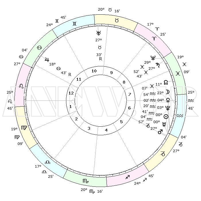 | | ΘΕΣΕΙΣ ΠΛΑΝΗΤΩΝ ΑΣΤΡΟΛΟΓΙΚΟΥ ΧΑΡΤΗ ΤΗΣ ΣΤΙΓΜΗΣ ΑΥΤΗΣ | | | | Πλανήτης | Ζώδιο | Μοίρες | Δεκαήμ. | Σε οίκο | Απόκλιση | | Ακμές των οίκων | | Ηλιος | Υδροχόος | 00°35' | Πρώτο | 6 | 20 S 01 | | 1ος | 01°11' | Λέων | | Σελήνη | Υδροχόος | 21°48' | Τρίτο | 7 | 15 S 43 | | 2ος | 22°18' | Λέων | | Ερμής | Αιγόκερως | 29°56' | Τρίτο | 6 | 22 S 09 | | 3ος | 17°30' | Παρθένος | | Αφροδίτη | Υδροχόος | 03°56' | Πρώτο | 7 | 20 S 22 | | 4ος | 18°41' | Ζυγός | | Αρης | Αιγόκερως | 27°53' | Τρίτο | 6 | 21 S 33 | | 5ος | 24°42' | Σκορπιός | | Δίας | Καρκίνος | 18°44'R | Δεύτερο | 12 | 22 N 24 | | 6ος | 00°13' | Αιγόκερως | | Κρόνος | Ιχθείς | 27°43' | Τρίτο | 9 | 02 S 56 | | 7ος | 01°11' | Υδροχόος | | Ουρανός | Ταύρος | 27°33'R | Τρίτο | 11 | 19 N 25 | | 8ος | 22°18' | Υδροχόος | | Ποσειδώνας | Ιχθείς | 29°51' | Τρίτο | 9 | 01 S 16 | | 9ος | 17°30' | Ιχθείς | | Πλούτωνας | Υδροχόος | 03°20' | Πρώτο | 7 | 23 S 06 | | 10ος | 18°41' | Κριός | | Β. Δεσμός | Ιχθείς | 11°08' | Δεύτερο | 8 | 07 S 23 | | 11ος | 24°42' | Ταύρος | | Ωροσκόπος | Λέων | 01°11' | Πρώτο | | | 12ος | 00°13' | Καρκίνος | | Μεσουράνημα | Κριός | 18°41' | Δεύτερο | | | |
