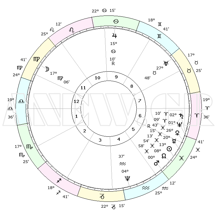| | ΘΕΣΕΙΣ ΠΛΑΝΗΤΩΝ ΑΣΤΡΟΛΟΓΙΚΟΥ ΧΑΡΤΗ ΤΗΣ ΣΤΙΓΜΗΣ ΑΥΤΗΣ | | | | Πλανήτης | Ζώδιο | Μοίρες | Δεκαήμ. | Σε οίκο | Απόκλιση | | Ακμές των οίκων | | Ηλιος | Ιχθείς | 13°10' | Δεύτερο | 6 | 06 S 37 | | 1ος | 02°51' | Ζυγός | | Σελήνη | Παρθένος | 16°21' | Δεύτερο | 12 | 04 N 45 | | 2ος | 29°38' | Ζυγός | | Ερμής | Ιχθείς | 20°17'R | Τρίτο | 6 | 00 S 31 | | 3ος | 00°11' | Τοξότης | | Αφροδίτη | Ιχθείς | 26°39' | Τρίτο | 6 | 02 S 32 | | 4ος | 03°12' | Αιγόκερως | | Αρης | Ιχθείς | 00°55' | Πρώτο | 5 | 12 S 10 | | 5ος | 06°09' | Υδροχόος | | Δίας | Καρκίνος | 15°10'R | Δεύτερο | 10 | 22 N 55 | | 6ος | 06°28' | Ιχθείς | | Κρόνος | Κριός | 02°10' | Πρώτο | 6 | 01 S 06 | | 7ος | 02°51' | Κριός | | Ουρανός | Ταύρος | 27°48' | Τρίτο | 8 | 19 N 29 | | 8ος | 29°38' | Κριός | | Ποσειδώνας | Κριός | 01°09' | Πρώτο | 6 | 00 S 45 | | 9ος | 00°11' | Δίδυμοι | | Πλούτωνας | Υδροχόος | 04°37' | Πρώτο | 4 | 22 S 52 | | 10ος | 03°12' | Καρκίνος | | Β. Δεσμός | Ιχθείς | 08°54' | Πρώτο | 6 | 08 S 14 | | 11ος | 06°09' | Λέων | | Ωροσκόπος | Ζυγός | 02°51' | Πρώτο | | | 12ος | 06°28' | Παρθένος | | Μεσουράνημα | Καρκίνος | 03°12' | Πρώτο | | | |