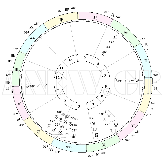 | | ΘΕΣΕΙΣ ΠΛΑΝΗΤΩΝ ΑΣΤΡΟΛΟΓΙΚΟΥ ΧΑΡΤΗ ΤΗΣ ΣΤΙΓΜΗΣ ΑΥΤΗΣ | | | | Πλανήτης | Ζώδιο | Μοίρες | Δεκαήμ. | Σε οίκο | Απόκλιση | | Ακμές των οίκων | | Ηλιος | Αιγόκερως | 23°49' | Τρίτο | 3 | 21 S 20 | | 1ος | 05°52' | Σκορπιός | | Σελήνη | Τοξότης | 00°07' | Πρώτο | 1 | 25 S 06 | | 2ος | 04°39' | Τοξότης | | Ερμής | Αιγόκερως | 19°01' | Δεύτερο | 3 | 23 S 47 | | 3ος | 07°07' | Αιγόκερως | | Αφροδίτη | Αιγόκερως | 25°34' | Τρίτο | 3 | 21 S 57 | | 4ος | 11°43' | Υδροχόος | | Αρης | Αιγόκερως | 22°42' | Τρίτο | 3 | 22 S 28 | | 5ος | 14°31' | Ιχθείς | | Δίας | Καρκίνος | 19°37'R | Δεύτερο | 9 | 22 N 16 | | 6ος | 12°37' | Κριός | | Κρόνος | Ιχθείς | 27°10' | Τρίτο | 5 | 03 S 10 | | 7ος | 05°52' | Ταύρος | | Ουρανός | Ταύρος | 27°39'R | Τρίτο | 7 | 19 N 26 | | 8ος | 04°39' | Δίδυμοι | | Ποσειδώνας | Ιχθείς | 29°43' | Τρίτο | 5 | 01 S 20 | | 9ος | 07°07' | Καρκίνος | | Πλούτωνας | Υδροχόος | 03°08' | Πρώτο | 3 | 23 S 08 | | 10ος | 11°43' | Λέων | | Β. Δεσμός | Ιχθείς | 11°29' | Δεύτερο | 4 | 07 S 15 | | 11ος | 14°32' | Παρθένος | | Ωροσκόπος | Σκορπιός | 05°52' | Πρώτο | | | 12ος | 12°37' | Ζυγός | | Μεσουράνημα | Λέων | 11°43' | Δεύτερο | | | |