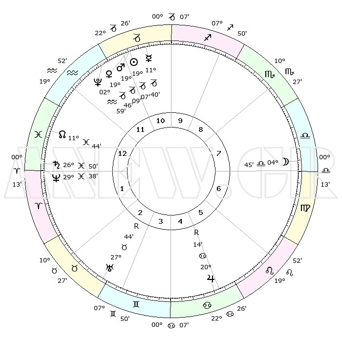 | | ΘΕΣΕΙΣ ΠΛΑΝΗΤΩΝ ΑΣΤΡΟΛΟΓΙΚΟΥ ΧΑΡΤΗ ΤΗΣ ΣΤΙΓΜΗΣ ΑΥΤΗΣ | | | | Πλανήτης | Ζώδιο | Μοίρες | Δεκαήμ. | Σε οίκο | Απόκλιση | | Ακμές των οίκων | | Ηλιος | Αιγόκερως | 18°15' | Δεύτερο | 8 | 22 S 11 | | 1ος | 15°47' | Δίδυμοι | | Σελήνη | Παρθένος | 24°07' | Τρίτο | 4 | 01 N 13 | | 2ος | 07°56' | Καρκίνος | | Ερμής | Αιγόκερως | 10°20' | Δεύτερο | 8 | 24 S 20 | | 3ος | 29°11' | Καρκίνος | | Αφροδίτη | Αιγόκερως | 18°42' | Δεύτερο | 8 | 22 S 54 | | 4ος | 23°28' | Λέων | | Αρης | Αιγόκερως | 18°30' | Δεύτερο | 8 | 23 S 05 | | 5ος | 24°51' | Παρθένος | | Δίας | Καρκίνος | 20°21'R | Τρίτο | 2 | 22 N 09 | | 6ος | 05°01' | Σκορπιός | | Κρόνος | Ιχθείς | 26°46' | Τρίτο | 11 | 03 S 20 | | 7ος | 15°47' | Τοξότης | | Ουρανός | Ταύρος | 27°45'R | Τρίτο | 12 | 19 N 28 | | 8ος | 07°56' | Αιγόκερως | | Ποσειδώνας | Ιχθείς | 29°37' | Τρίτο | 11 | 01 S 22 | | 9ος | 29°11' | Αιγόκερως | | Πλούτωνας | Υδροχόος | 02°57' | Πρώτο | 9 | 23 S 10 | | 10ος | 23°29' | Υδροχόος | | Β. Δεσμός | Ιχθείς | 11°46' | Δεύτερο | 10 | 07 S 09 | | 11ος | 24°51' | Ιχθείς | | Ωροσκόπος | Δίδυμοι | 15°47' | Δεύτερο | | | 12ος | 05°01' | Ταύρος | | Μεσουράνημα | Υδροχόος | 23°29' | Τρίτο | | | |