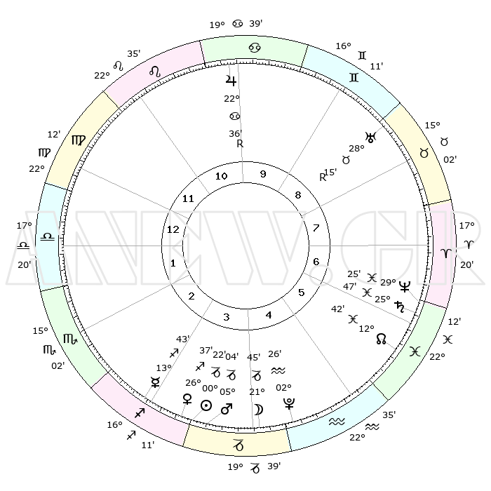 | | ΘΕΣΕΙΣ ΠΛΑΝΗΤΩΝ ΑΣΤΡΟΛΟΓΙΚΟΥ ΧΑΡΤΗ ΤΗΣ ΣΤΙΓΜΗΣ ΑΥΤΗΣ | | | | Πλανήτης | Ζώδιο | Μοίρες | Δεκαήμ. | Σε οίκο | Απόκλιση | | Ακμές των οίκων | | Ηλιος | Αιγόκερως | 00°18' | Πρώτο | 4 | 23 S 26 | | 1ος | 25°27' | Παρθένος | | Σελήνη | Αιγόκερως | 20°50' | Τρίτο | 4 | 25 S 40 | | 2ος | 21°42' | Ζυγός | | Ερμής | Τοξότης | 13°37' | Δεύτερο | 3 | 21 S 47 | | 3ος | 21°57' | Σκορπιός | | Αφροδίτη | Τοξότης | 26°32' | Τρίτο | 4 | 23 S 30 | | 4ος | 24°53' | Τοξότης | | Αρης | Αιγόκερως | 05°00' | Πρώτο | 4 | 24 S 10 | | 5ος | 27°56' | Αιγόκερως | | Δίας | Καρκίνος | 22°36'R | Τρίτο | 10 | 21 N 45 | | 6ος | 28°33' | Υδροχόος | | Κρόνος | Ιχθείς | 25°47' | Τρίτο | 7 | 03 S 47 | | 7ος | 25°27' | Ιχθείς | | Ουρανός | Ταύρος | 28°15'R | Τρίτο | 9 | 19 N 34 | | 8ος | 21°42' | Κριός | | Ποσειδώνας | Ιχθείς | 29°25' | Τρίτο | 7 | 01 S 28 | | 9ος | 21°57' | Ταύρος | | Πλούτωνας | Υδροχόος | 02°26' | Πρώτο | 5 | 23 S 17 | | 10ος | 24°53' | Δίδυμοι | | Β. Δεσμός | Ιχθείς | 12°42' | Δεύτερο | 6 | 06 S 47 | | 11ος | 27°56' | Καρκίνος | | Ωροσκόπος | Παρθένος | 25°27' | Τρίτο | | | 12ος | 28°33' | Λέων | | Μεσουράνημα | Δίδυμοι | 24°53' | Τρίτο | | | |