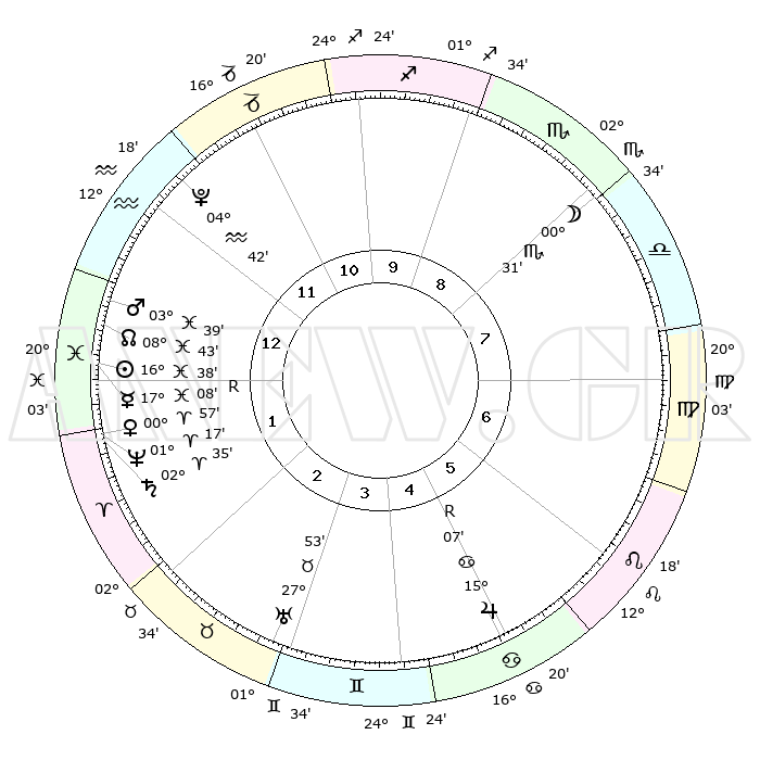 | | ΘΕΣΕΙΣ ΠΛΑΝΗΤΩΝ ΑΣΤΡΟΛΟΓΙΚΟΥ ΧΑΡΤΗ ΤΗΣ ΣΤΙΓΜΗΣ ΑΥΤΗΣ | | | | Πλανήτης | Ζώδιο | Μοίρες | Δεκαήμ. | Σε οίκο | Απόκλιση | | Ακμές των οίκων | | Ηλιος | Ιχθείς | 16°27' | Δεύτερο | 3 | 05 S 21 | | 1ος | 26°21' | Τοξότης | | Σελήνη | Ζυγός | 28°11' | Τρίτο | 10 | 14 S 33 | | 2ος | 02°35' | Υδροχόος | | Ερμής | Ιχθείς | 17°19'R | Δεύτερο | 3 | 01 S 38 | | 3ος | 12°17' | Ιχθείς | | Αφροδίτη | Κριός | 00°43' | Πρώτο | 3 | 00 S 51 | | 4ος | 16°46' | Κριός | | Αρης | Ιχθείς | 03°30' | Πρώτο | 2 | 11 S 15 | | 5ος | 13°41' | Ταύρος | | Δίας | Καρκίνος | 15°07'R | Δεύτερο | 7 | 22 N 56 | | 6ος | 05°45' | Δίδυμοι | | Κρόνος | Κριός | 02°34' | Πρώτο | 3 | 00 S 56 | | 7ος | 26°21' | Δίδυμοι | | Ουρανός | Ταύρος | 27°53' | Τρίτο | 5 | 19 N 30 | | 8ος | 02°35' | Λέων | | Ποσειδώνας | Κριός | 01°16' | Πρώτο | 3 | 00 S 42 | | 9ος | 12°17' | Παρθένος | | Πλούτωνας | Υδροχόος | 04°42' | Πρώτο | 2 | 22 S 51 | | 10ος | 16°46' | Ζυγός | | Β. Δεσμός | Ιχθείς | 08°44' | Πρώτο | 2 | 08 S 18 | | 11ος | 13°41' | Σκορπιός | | Ωροσκόπος | Τοξότης | 26°21' | Τρίτο | | | 12ος | 05°45' | Τοξότης | | Μεσουράνημα | Ζυγός | 16°46' | Δεύτερο | | | |