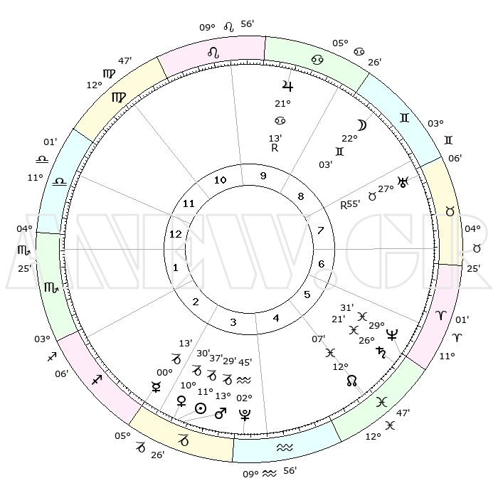 | | ΘΕΣΕΙΣ ΠΛΑΝΗΤΩΝ ΑΣΤΡΟΛΟΓΙΚΟΥ ΧΑΡΤΗ ΤΗΣ ΣΤΙΓΜΗΣ ΑΥΤΗΣ | | | | Πλανήτης | Ζώδιο | Μοίρες | Δεκαήμ. | Σε οίκο | Απόκλιση | | Ακμές των οίκων | | Ηλιος | Αιγόκερως | 11°32' | Δεύτερο | 3 | 22 S 56 | | 1ος | 12°17' | Ζυγός | | Σελήνη | Δίδυμοι | 20°55' | Τρίτο | 9 | 28 N 06 | | 2ος | 09°41' | Σκορπιός | | Ερμής | Αιγόκερως | 00°06' | Πρώτο | 3 | 24 S 06 | | 3ος | 10°36' | Τοξότης | | Αφροδίτη | Αιγόκερως | 10°24' | Δεύτερο | 3 | 23 S 34 | | 4ος | 13°52' | Αιγόκερως | | Αρης | Αιγόκερως | 13°25' | Δεύτερο | 3 | 23 S 39 | | 5ος | 16°48' | Υδροχόος | | Δίας | Καρκίνος | 21°14'R | Τρίτο | 10 | 22 N 00 | | 6ος | 16°42' | Ιχθείς | | Κρόνος | Ιχθείς | 26°21' | Τρίτο | 6 | 03 S 32 | | 7ος | 12°17' | Κριός | | Ουρανός | Ταύρος | 27°55'R | Τρίτο | 8 | 19 N 30 | | 8ος | 09°41' | Ταύρος | | Ποσειδώνας | Ιχθείς | 29°31' | Τρίτο | 6 | 01 S 25 | | 9ος | 10°36' | Δίδυμοι | | Πλούτωνας | Υδροχόος | 02°45' | Πρώτο | 4 | 23 S 13 | | 10ος | 13°52' | Καρκίνος | | Β. Δεσμός | Ιχθείς | 12°07' | Δεύτερο | 5 | 07 S 01 | | 11ος | 16°48' | Λέων | | Ωροσκόπος | Ζυγός | 12°17' | Δεύτερο | | | 12ος | 16°42' | Παρθένος | | Μεσουράνημα | Καρκίνος | 13°52' | Δεύτερο | | | |