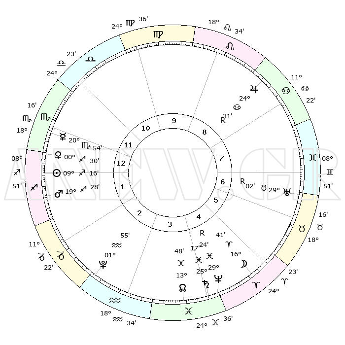 | | ΘΕΣΕΙΣ ΠΛΑΝΗΤΩΝ ΑΣΤΡΟΛΟΓΙΚΟΥ ΧΑΡΤΗ ΤΗΣ ΣΤΙΓΜΗΣ ΑΥΤΗΣ | | | | Πλανήτης | Ζώδιο | Μοίρες | Δεκαήμ. | Σε οίκο | Απόκλιση | | Ακμές των οίκων | | Ηλιος | Τοξότης | 09°14' | Πρώτο | 1 | 21 S 50 | | 1ος | 29°50' | Σκορπιός | | Σελήνη | Κριός | 16°15' | Δεύτερο | 5 | 08 N 51 | | 2ος | 00°56' | Αιγόκερως | | Ερμής | Σκορπιός | 20°54' | Τρίτο | 12 | 15 S 27 | | 3ος | 06°37' | Υδροχόος | | Αφροδίτη | Τοξότης | 00°27' | Πρώτο | 1 | 19 S 33 | | 4ος | 12°39' | Ιχθείς | | Αρης | Τοξότης | 19°27' | Δεύτερο | 1 | 23 S 41 | | 5ος | 13°43' | Κριός | | Δίας | Καρκίνος | 24°31'R | Τρίτο | 8 | 21 N 22 | | 6ος | 08°47' | Ταύρος | | Κρόνος | Ιχθείς | 25°17' | Τρίτο | 4 | 04 S 03 | | 7ος | 29°50' | Ταύρος | | Ουρανός | Ταύρος | 29°02'R | Τρίτο | 6 | 19 N 44 | | 8ος | 00°56' | Καρκίνος | | Ποσειδώνας | Ιχθείς | 29°24'R | Τρίτο | 4 | 01 S 29 | | 9ος | 06°37' | Λέων | | Πλούτωνας | Υδροχόος | 01°55' | Πρώτο | 2 | 23 S 24 | | 10ος | 12°39' | Παρθένος | | Β. Δεσμός | Ιχθείς | 13°48' | Δεύτερο | 4 | 06 S 22 | | 11ος | 13°43' | Ζυγός | | Ωροσκόπος | Σκορπιός | 29°50' | Τρίτο | | | 12ος | 08°47' | Σκορπιός | | Μεσουράνημα | Παρθένος | 12°39' | Δεύτερο | | | |