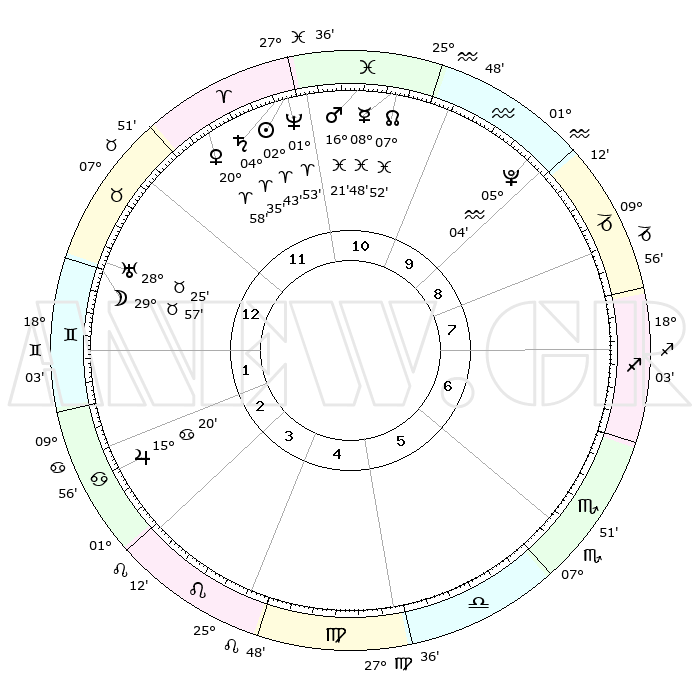 | | ΘΕΣΕΙΣ ΠΛΑΝΗΤΩΝ ΑΣΤΡΟΛΟΓΙΚΟΥ ΧΑΡΤΗ ΤΗΣ ΣΤΙΓΜΗΣ ΑΥΤΗΣ | | | | Πλανήτης | Ζώδιο | Μοίρες | Δεκαήμ. | Σε οίκο | Απόκλιση | | Ακμές των οίκων | | Ηλιος | Κριός | 02°39' | Πρώτο | 11 | 01 N 03 | | 1ος | 18°56' | Ταύρος | | Σελήνη | Ταύρος | 28°55' | Τρίτο | 1 | 24 N 56 | | 2ος | 16°12' | Δίδυμοι | | Ερμής | Ιχθείς | 08°47' | Πρώτο | 11 | 07 S 54 | | 3ος | 08°10' | Καρκίνος | | Αφροδίτη | Κριός | 20°53' | Τρίτο | 12 | 07 N 26 | | 4ος | 00°17' | Λέων | | Αρης | Ιχθείς | 16°17' | Δεύτερο | 11 | 06 S 24 | | 5ος | 26°59' | Λέων | | Δίας | Καρκίνος | 15°19' | Δεύτερο | 3 | 22 N 55 | | 6ος | 03°28' | Ζυγός | | Κρόνος | Κριός | 04°34' | Πρώτο | 12 | 00 S 08 | | 7ος | 18°56' | Σκορπιός | | Ουρανός | Ταύρος | 28°24' | Τρίτο | 1 | 19 N 38 | | 8ος | 16°12' | Τοξότης | | Ποσειδώνας | Κριός | 01°53' | Πρώτο | 11 | 00 S 27 | | 9ος | 08°10' | Αιγόκερως | | Πλούτωνας | Υδροχόος | 05°04' | Πρώτο | 10 | 22 S 48 | | 10ος | 00°17' | Υδροχόος | | Β. Δεσμός | Ιχθείς | 07°52' | Πρώτο | 11 | 08 S 37 | | 11ος | 26°59' | Υδροχόος | | Ωροσκόπος | Ταύρος | 18°56' | Δεύτερο | | | 12ος | 03°28' | Κριός | | Μεσουράνημα | Υδροχόος | 00°17' | Πρώτο | | | |