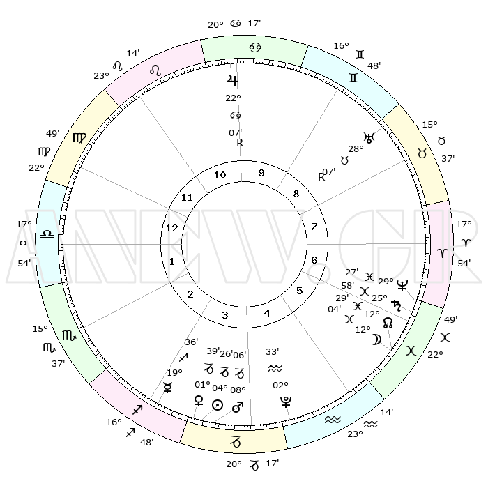 | | ΘΕΣΕΙΣ ΠΛΑΝΗΤΩΝ ΑΣΤΡΟΛΟΓΙΚΟΥ ΧΑΡΤΗ ΤΗΣ ΣΤΙΓΜΗΣ ΑΥΤΗΣ | | | | Πλανήτης | Ζώδιο | Μοίρες | Δεκαήμ. | Σε οίκο | Απόκλιση | | Ακμές των οίκων | | Ηλιος | Αιγόκερως | 04°22' | Πρώτο | 4 | 23 S 22 | | 1ος | 25°48' | Παρθένος | | Σελήνη | Ιχθείς | 11°06' | Δεύτερο | 6 | 07 S 25 | | 2ος | 22°05' | Ζυγός | | Ερμής | Τοξότης | 19°29' | Δεύτερο | 3 | 22 S 52 | | 3ος | 22°21' | Σκορπιός | | Αφροδίτη | Αιγόκερως | 01°33' | Πρώτο | 4 | 23 S 42 | | 4ος | 25°17' | Τοξότης | | Αρης | Αιγόκερως | 08°03' | Πρώτο | 4 | 24 S 02 | | 5ος | 28°20' | Αιγόκερως | | Δίας | Καρκίνος | 22°08'R | Τρίτο | 10 | 21 N 50 | | 6ος | 28°55' | Υδροχόος | | Κρόνος | Ιχθείς | 25°58' | Τρίτο | 7 | 03 S 42 | | 7ος | 25°48' | Ιχθείς | | Ουρανός | Ταύρος | 28°07'R | Τρίτο | 9 | 19 N 33 | | 8ος | 22°05' | Κριός | | Ποσειδώνας | Ιχθείς | 29°27' | Τρίτο | 7 | 01 S 27 | | 9ος | 22°21' | Ταύρος | | Πλούτωνας | Υδροχόος | 02°33' | Πρώτο | 5 | 23 S 15 | | 10ος | 25°17' | Δίδυμοι | | Β. Δεσμός | Ιχθείς | 12°30' | Δεύτερο | 6 | 06 S 52 | | 11ος | 28°20' | Καρκίνος | | Ωροσκόπος | Παρθένος | 25°48' | Τρίτο | | | 12ος | 28°55' | Λέων | | Μεσουράνημα | Δίδυμοι | 25°17' | Τρίτο | | | |