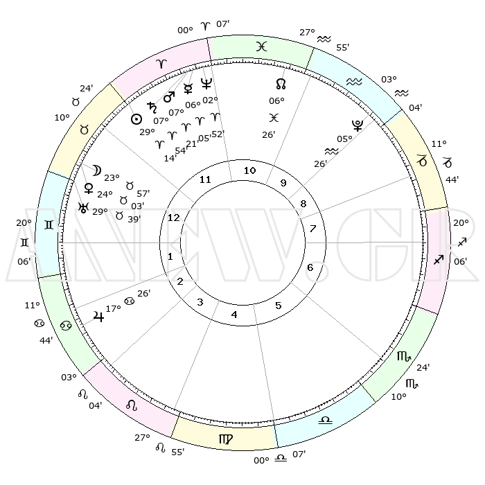 | | ΘΕΣΕΙΣ ΠΛΑΝΗΤΩΝ ΑΣΤΡΟΛΟΓΙΚΟΥ ΧΑΡΤΗ ΤΗΣ ΣΤΙΓΜΗΣ ΑΥΤΗΣ | | | | Πλανήτης | Ζώδιο | Μοίρες | Δεκαήμ. | Σε οίκο | Απόκλιση | | Ακμές των οίκων | | Ηλιος | Κριός | 29°10' | Τρίτο | 12 | 11 N 11 | | 1ος | 24°05' | Ταύρος | | Σελήνη | Ταύρος | 22°59' | Τρίτο | 12 | 23 N 17 | | 2ος | 20°09' | Δίδυμοι | | Ερμής | Κριός | 05°59' | Πρώτο | 11 | 00 S 02 | | 3ος | 11°50' | Καρκίνος | | Αφροδίτη | Ταύρος | 23°58' | Τρίτο | 12 | 19 N 07 | | 4ος | 04°12' | Λέων | | Αρης | Κριός | 07°18' | Πρώτο | 11 | 02 N 01 | | 5ος | 01°41' | Παρθένος | | Δίας | Καρκίνος | 17°25' | Δεύτερο | 3 | 22 N 41 | | 6ος | 09°08' | Ζυγός | | Κρόνος | Κριός | 07°53' | Πρώτο | 11 | 01 N 09 | | 7ος | 24°05' | Σκορπιός | | Ουρανός | Ταύρος | 29°38' | Τρίτο | 1 | 19 N 54 | | 8ος | 20°09' | Τοξότης | | Ποσειδώνας | Κριός | 02°52' | Πρώτο | 11 | 00 S 04 | | 9ος | 11°50' | Αιγόκερως | | Πλούτωνας | Υδροχόος | 05°26' | Πρώτο | 10 | 22 S 47 | | 10ος | 04°12' | Υδροχόος | | Β. Δεσμός | Ιχθείς | 06°26' | Πρώτο | 11 | 09 S 09 | | 11ος | 01°41' | Ιχθείς | | Ωροσκόπος | Ταύρος | 24°05' | Τρίτο | | | 12ος | 09°08' | Κριός | | Μεσουράνημα | Υδροχόος | 04°12' | Πρώτο | | | |