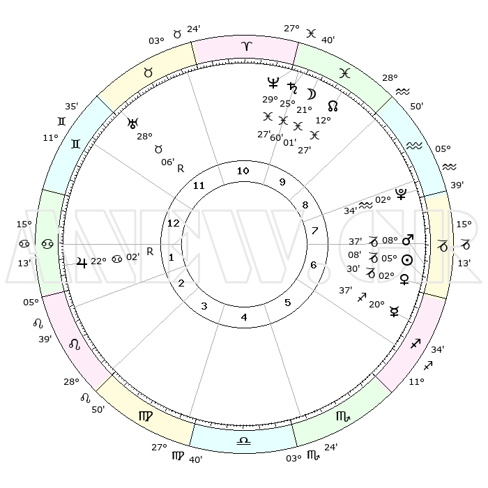 | | ΘΕΣΕΙΣ ΠΛΑΝΗΤΩΝ ΑΣΤΡΟΛΟΓΙΚΟΥ ΧΑΡΤΗ ΤΗΣ ΣΤΙΓΜΗΣ ΑΥΤΗΣ | | | | Πλανήτης | Ζώδιο | Μοίρες | Δεκαήμ. | Σε οίκο | Απόκλιση | | Ακμές των οίκων | | Ηλιος | Αιγόκερως | 05°03' | Πρώτο | 7 | 23 S 20 | | 1ος | 21°46' | Δίδυμοι | | Σελήνη | Ιχθείς | 20°04' | Τρίτο | 10 | 03 S 13 | | 2ος | 13°13' | Καρκίνος | | Ερμής | Τοξότης | 20°30' | Τρίτο | 6 | 23 S 02 | | 3ος | 04°36' | Λέων | | Αφροδίτη | Αιγόκερως | 02°25' | Πρώτο | 7 | 23 S 43 | | 4ος | 29°41' | Λέων | | Αρης | Αιγόκερως | 08°34' | Πρώτο | 7 | 24 S 01 | | 5ος | 02°12' | Ζυγός | | Δίας | Καρκίνος | 22°03'R | Τρίτο | 2 | 21 N 51 | | 6ος | 12°30' | Σκορπιός | | Κρόνος | Ιχθείς | 25°60' | Τρίτο | 10 | 03 S 41 | | 7ος | 21°46' | Τοξότης | | Ουρανός | Ταύρος | 28°06'R | Τρίτο | 12 | 19 N 32 | | 8ος | 13°13' | Αιγόκερως | | Ποσειδώνας | Ιχθείς | 29°27' | Τρίτο | 10 | 01 S 27 | | 9ος | 04°36' | Υδροχόος | | Πλούτωνας | Υδροχόος | 02°34' | Πρώτο | 8 | 23 S 15 | | 10ος | 29°41' | Υδροχόος | | Β. Δεσμός | Ιχθείς | 12°27' | Δεύτερο | 10 | 06 S 53 | | 11ος | 02°12' | Κριός | | Ωροσκόπος | Δίδυμοι | 21°46' | Τρίτο | | | 12ος | 12°30' | Ταύρος | | Μεσουράνημα | Υδροχόος | 29°41' | Τρίτο | | | |
