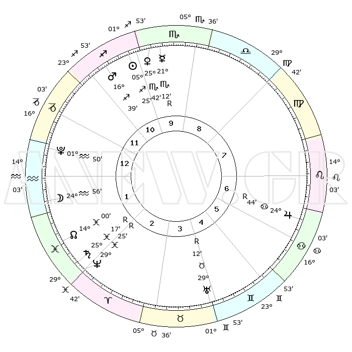 | | ΘΕΣΕΙΣ ΠΛΑΝΗΤΩΝ ΑΣΤΡΟΛΟΓΙΚΟΥ ΧΑΡΤΗ ΤΗΣ ΣΤΙΓΜΗΣ ΑΥΤΗΣ | | | | Πλανήτης | Ζώδιο | Μοίρες | Δεκαήμ. | Σε οίκο | Απόκλιση | | Ακμές των οίκων | | Ηλιος | Τοξότης | 05°22' | Πρώτο | 10 | 21 S 12 | | 1ος | 28°44' | Αιγόκερως | | Σελήνη | Υδροχόος | 24°30' | Τρίτο | 1 | 14 S 58 | | 2ος | 12°37' | Ιχθείς | | Ερμής | Σκορπιός | 21°13'R | Τρίτο | 10 | 15 S 50 | | 3ος | 21°16' | Κριός | | Αφροδίτη | Σκορπιός | 25°40' | Τρίτο | 10 | 18 S 22 | | 4ος | 19°57' | Ταύρος | | Αρης | Τοξότης | 16°38' | Δεύτερο | 11 | 23 S 23 | | 5ος | 12°48' | Δίδυμοι | | Δίας | Καρκίνος | 24°44'R | Τρίτο | 6 | 21 N 19 | | 6ος | 04°11' | Καρκίνος | | Κρόνος | Ιχθείς | 25°17'R | Τρίτο | 2 | 04 S 04 | | 7ος | 28°44' | Καρκίνος | | Ουρανός | Ταύρος | 29°12'R | Τρίτο | 4 | 19 N 46 | | 8ος | 12°37' | Παρθένος | | Ποσειδώνας | Ιχθείς | 29°25'R | Τρίτο | 2 | 01 S 28 | | 9ος | 21°16' | Ζυγός | | Πλούτωνας | Υδροχόος | 01°50' | Πρώτο | 1 | 23 S 25 | | 10ος | 19°57' | Σκορπιός | | Β. Δεσμός | Ιχθείς | 14°00' | Δεύτερο | 2 | 06 S 18 | | 11ος | 12°48' | Τοξότης | | Ωροσκόπος | Αιγόκερως | 28°44' | Τρίτο | | | 12ος | 04°11' | Αιγόκερως | | Μεσουράνημα | Σκορπιός | 19°57' | Δεύτερο | | | |
