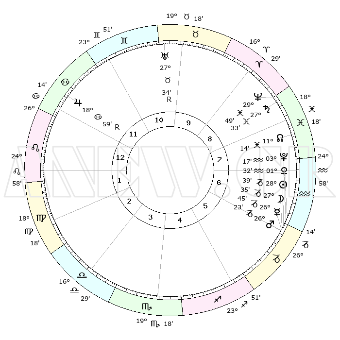| | ΘΕΣΕΙΣ ΠΛΑΝΗΤΩΝ ΑΣΤΡΟΛΟΓΙΚΟΥ ΧΑΡΤΗ ΤΗΣ ΣΤΙΓΜΗΣ ΑΥΤΗΣ | | | | Πλανήτης | Ζώδιο | Μοίρες | Δεκαήμ. | Σε οίκο | Απόκλιση | | Ακμές των οίκων | | Ηλιος | Αιγόκερως | 28°35' | Τρίτο | 6 | 20 S 26 | | 1ος | 08°29' | Λέων | | Σελήνη | Αιγόκερως | 26°53' | Τρίτο | 6 | 24 S 12 | | 2ος | 00°10' | Παρθένος | | Ερμής | Αιγόκερως | 26°40' | Τρίτο | 6 | 22 S 45 | | 3ος | 26°22' | Παρθένος | | Αφροδίτη | Υδροχόος | 01°27' | Πρώτο | 6 | 20 S 53 | | 4ος | 28°18' | Ζυγός | | Αρης | Αιγόκερως | 26°21' | Τρίτο | 6 | 21 S 51 | | 5ος | 04°00' | Τοξότης | | Δίας | Καρκίνος | 18°59'R | Δεύτερο | 12 | 22 N 22 | | 6ος | 08°23' | Αιγόκερως | | Κρόνος | Ιχθείς | 27°33' | Τρίτο | 9 | 03 S 00 | | 7ος | 08°29' | Υδροχόος | | Ουρανός | Ταύρος | 27°34'R | Τρίτο | 10 | 19 N 26 | | 8ος | 00°10' | Ιχθείς | | Ποσειδώνας | Ιχθείς | 29°49' | Τρίτο | 9 | 01 S 17 | | 9ος | 26°22' | Ιχθείς | | Πλούτωνας | Υδροχόος | 03°16' | Πρώτο | 6 | 23 S 06 | | 10ος | 28°18' | Κριός | | Β. Δεσμός | Ιχθείς | 11°14' | Δεύτερο | 8 | 07 S 21 | | 11ος | 04°00' | Δίδυμοι | | Ωροσκόπος | Λέων | 08°29' | Πρώτο | | | 12ος | 08°23' | Καρκίνος | | Μεσουράνημα | Κριός | 28°18' | Τρίτο | | | |
