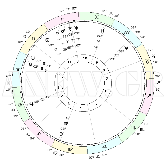 | | ΘΕΣΕΙΣ ΠΛΑΝΗΤΩΝ ΑΣΤΡΟΛΟΓΙΚΟΥ ΧΑΡΤΗ ΤΗΣ ΣΤΙΓΜΗΣ ΑΥΤΗΣ | | | | Πλανήτης | Ζώδιο | Μοίρες | Δεκαήμ. | Σε οίκο | Απόκλιση | | Ακμές των οίκων | | Ηλιος | Ταύρος | 06°00' | Πρώτο | 12 | 13 N 31 | | 1ος | 05°29' | Δίδυμοι | | Σελήνη | Παρθένος | 02°16' | Πρώτο | 4 | 11 N 05 | | 2ος | 29°15' | Δίδυμοι | | Ερμής | Κριός | 17°23' | Δεύτερο | 11 | 04 N 39 | | 3ος | 20°31' | Καρκίνος | | Αφροδίτη | Δίδυμοι | 02°30' | Πρώτο | 12 | 21 N 20 | | 4ος | 13°43' | Λέων | | Αρης | Κριός | 12°43' | Δεύτερο | 11 | 04 N 10 | | 5ος | 13°10' | Παρθένος | | Δίας | Καρκίνος | 18°16' | Δεύτερο | 2 | 22 N 34 | | 6ος | 22°23' | Ζυγός | | Κρόνος | Κριός | 08°43' | Πρώτο | 11 | 01 N 28 | | 7ος | 05°29' | Τοξότης | | Ουρανός | Δίδυμοι | 00°01' | Πρώτο | 12 | 19 N 59 | | 8ος | 29°15' | Τοξότης | | Ποσειδώνας | Κριός | 03°07' | Πρώτο | 11 | 00 N 02 | | 9ος | 20°31' | Αιγόκερως | | Πλούτωνας | Υδροχόος | 05°29' | Πρώτο | 9 | 22 S 48 | | 10ος | 13°43' | Υδροχόος | | Β. Δεσμός | Ιχθείς | 06°04' | Πρώτο | 10 | 09 S 17 | | 11ος | 13°10' | Ιχθείς | | Ωροσκόπος | Δίδυμοι | 05°29' | Πρώτο | | | 12ος | 22°23' | Κριός | | Μεσουράνημα | Υδροχόος | 13°43' | Δεύτερο | | | |