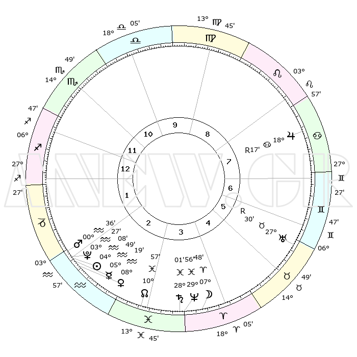 | | ΘΕΣΕΙΣ ΠΛΑΝΗΤΩΝ ΑΣΤΡΟΛΟΓΙΚΟΥ ΧΑΡΤΗ ΤΗΣ ΣΤΙΓΜΗΣ ΑΥΤΗΣ | | | | Πλανήτης | Ζώδιο | Μοίρες | Δεκαήμ. | Σε οίκο | Απόκλιση | | Ακμές των οίκων | | Ηλιος | Υδροχόος | 04°03' | Πρώτο | 2 | 19 S 14 | | 1ος | 02°32' | Τοξότης | | Σελήνη | Κριός | 06°42' | Πρώτο | 4 | 04 N 51 | | 2ος | 04°02' | Αιγόκερως | | Ερμής | Υδροχόος | 05°41' | Πρώτο | 2 | 20 S 52 | | 3ος | 10°10' | Υδροχόος | | Αφροδίτη | Υδροχόος | 08°13' | Πρώτο | 2 | 19 S 23 | | 4ος | 16°15' | Ιχθείς | | Αρης | Υδροχόος | 00°32' | Πρώτο | 2 | 21 S 01 | | 5ος | 16°57' | Κριός | | Δίας | Καρκίνος | 18°18'R | Δεύτερο | 8 | 22 N 28 | | 6ος | 11°40' | Ταύρος | | Κρόνος | Ιχθείς | 28°00' | Τρίτο | 4 | 02 S 48 | | 7ος | 02°32' | Δίδυμοι | | Ουρανός | Ταύρος | 27°31'R | Τρίτο | 6 | 19 N 25 | | 8ος | 04°02' | Καρκίνος | | Ποσειδώνας | Ιχθείς | 29°56' | Τρίτο | 4 | 01 S 14 | | 9ος | 10°10' | Λέων | | Πλούτωνας | Υδροχόος | 03°27' | Πρώτο | 2 | 23 S 04 | | 10ος | 16°15' | Παρθένος | | Β. Δεσμός | Ιχθείς | 10°57' | Δεύτερο | 3 | 07 S 27 | | 11ος | 16°57' | Ζυγός | | Ωροσκόπος | Τοξότης | 02°32' | Πρώτο | | | 12ος | 11°40' | Σκορπιός | | Μεσουράνημα | Παρθένος | 16°15' | Δεύτερο | | | |