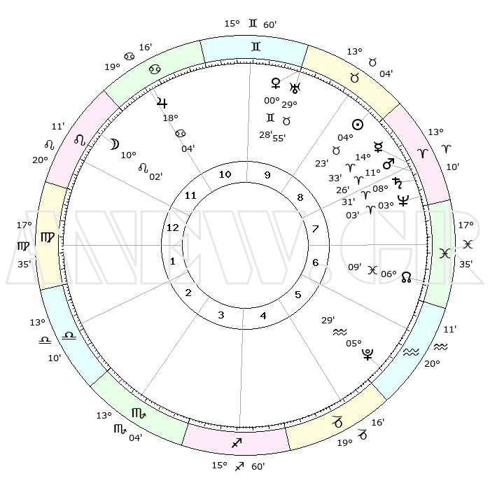 | | ΘΕΣΕΙΣ ΠΛΑΝΗΤΩΝ ΑΣΤΡΟΛΟΓΙΚΟΥ ΧΑΡΤΗ ΤΗΣ ΣΤΙΓΜΗΣ ΑΥΤΗΣ | | | | Πλανήτης | Ζώδιο | Μοίρες | Δεκαήμ. | Σε οίκο | Απόκλιση | | Ακμές των οίκων | | Ηλιος | Ταύρος | 04°19' | Πρώτο | 9 | 12 N 57 | | 1ος | 29°42' | Λέων | | Σελήνη | Λέων | 09°12' | Πρώτο | 12 | 20 N 16 | | 2ος | 23°31' | Παρθένος | | Ερμής | Κριός | 14°27' | Δεύτερο | 8 | 03 N 25 | | 3ος | 22°10' | Ζυγός | | Αφροδίτη | Δίδυμοι | 00°24' | Πρώτο | 10 | 20 N 49 | | 4ος | 25°05' | Σκορπιός | | Αρης | Κριός | 11°23' | Δεύτερο | 8 | 03 N 39 | | 5ος | 29°18' | Τοξότης | | Δίας | Καρκίνος | 18°03' | Δεύτερο | 11 | 22 N 36 | | 6ος | 01°16' | Υδροχόος | | Κρόνος | Κριός | 08°31' | Πρώτο | 8 | 01 N 23 | | 7ος | 29°42' | Υδροχόος | | Ουρανός | Ταύρος | 29°55' | Τρίτο | 10 | 19 N 58 | | 8ος | 23°31' | Ιχθείς | | Ποσειδώνας | Κριός | 03°03' | Πρώτο | 8 | 00 N 00 | | 9ος | 22°10' | Κριός | | Πλούτωνας | Υδροχόος | 05°28' | Πρώτο | 6 | 22 S 48 | | 10ος | 25°05' | Ταύρος | | Β. Δεσμός | Ιχθείς | 06°10' | Πρώτο | 7 | 09 S 15 | | 11ος | 29°18' | Δίδυμοι | | Ωροσκόπος | Λέων | 29°42' | Τρίτο | | | 12ος | 01°16' | Λέων | | Μεσουράνημα | Ταύρος | 25°05' | Τρίτο | | | |
