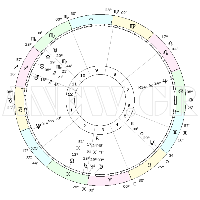 | | ΘΕΣΕΙΣ ΠΛΑΝΗΤΩΝ ΑΣΤΡΟΛΟΓΙΚΟΥ ΧΑΡΤΗ ΤΗΣ ΣΤΙΓΜΗΣ ΑΥΤΗΣ | | | | Πλανήτης | Ζώδιο | Μοίρες | Δεκαήμ. | Σε οίκο | Απόκλιση | | Ακμές των οίκων | | Ηλιος | Τοξότης | 08°18' | Πρώτο | 12 | 21 S 41 | | 1ος | 23°49' | Τοξότης | | Σελήνη | Κριός | 03°12' | Πρώτο | 3 | 02 N 46 | | 2ος | 29°27' | Αιγόκερως | | Ερμής | Σκορπιός | 20°44' | Τρίτο | 11 | 15 S 27 | | 3ος | 08°52' | Ιχθείς | | Αφροδίτη | Σκορπιός | 29°18' | Τρίτο | 11 | 19 S 17 | | 4ος | 13°42' | Κριός | | Αρης | Τοξότης | 18°46' | Δεύτερο | 12 | 23 S 37 | | 5ος | 11°01' | Ταύρος | | Δίας | Καρκίνος | 24°35'R | Τρίτο | 7 | 21 N 21 | | 6ος | 03°18' | Δίδυμοι | | Κρόνος | Ιχθείς | 25°17' | Τρίτο | 3 | 04 S 03 | | 7ος | 23°49' | Δίδυμοι | | Ουρανός | Ταύρος | 29°05'R | Τρίτο | 5 | 19 N 45 | | 8ος | 29°27' | Καρκίνος | | Ποσειδώνας | Ιχθείς | 29°24'R | Τρίτο | 3 | 01 S 29 | | 9ος | 08°52' | Παρθένος | | Πλούτωνας | Υδροχόος | 01°53' | Πρώτο | 2 | 23 S 24 | | 10ος | 13°42' | Ζυγός | | Β. Δεσμός | Ιχθείς | 13°51' | Δεύτερο | 3 | 06 S 21 | | 11ος | 11°02' | Σκορπιός | | Ωροσκόπος | Τοξότης | 23°49' | Τρίτο | | | 12ος | 03°18' | Τοξότης | | Μεσουράνημα | Ζυγός | 13°42' | Δεύτερο | | | |