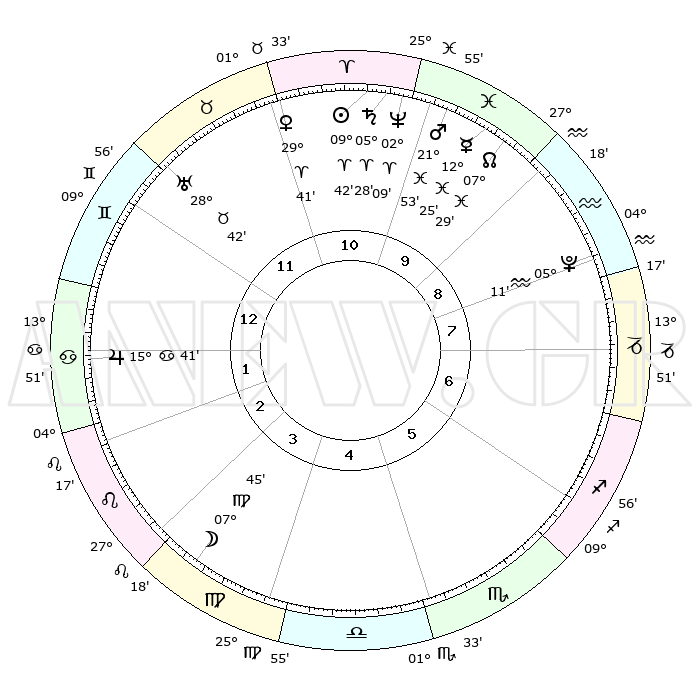 | | ΘΕΣΕΙΣ ΠΛΑΝΗΤΩΝ ΑΣΤΡΟΛΟΓΙΚΟΥ ΧΑΡΤΗ ΤΗΣ ΣΤΙΓΜΗΣ ΑΥΤΗΣ | | | | Πλανήτης | Ζώδιο | Μοίρες | Δεκαήμ. | Σε οίκο | Απόκλιση | | Ακμές των οίκων | | Ηλιος | Κριός | 09°37' | Πρώτο | 11 | 03 N 49 | | 1ος | 14°21' | Δίδυμοι | | Σελήνη | Παρθένος | 06°35' | Πρώτο | 4 | 09 N 17 | | 2ος | 06°42' | Καρκίνος | | Ερμής | Ιχθείς | 12°21' | Δεύτερο | 10 | 07 S 52 | | 3ος | 27°55' | Καρκίνος | | Αφροδίτη | Κριός | 29°35' | Τρίτο | 11 | 10 N 50 | | 4ος | 22°03' | Λέων | | Αρης | Ιχθείς | 21°49' | Τρίτο | 10 | 04 S 13 | | 5ος | 23°10' | Παρθένος | | Δίας | Καρκίνος | 15°40' | Δεύτερο | 2 | 22 N 53 | | 6ος | 03°14' | Σκορπιός | | Κρόνος | Κριός | 05°27' | Πρώτο | 11 | 00 N 13 | | 7ος | 14°21' | Τοξότης | | Ουρανός | Ταύρος | 28°41' | Τρίτο | 12 | 19 N 42 | | 8ος | 06°42' | Αιγόκερως | | Ποσειδώνας | Κριός | 02°09' | Πρώτο | 11 | 00 S 21 | | 9ος | 27°56' | Αιγόκερως | | Πλούτωνας | Υδροχόος | 05°11' | Πρώτο | 9 | 22 S 48 | | 10ος | 22°03' | Υδροχόος | | Β. Δεσμός | Ιχθείς | 07°30' | Πρώτο | 10 | 08 S 45 | | 11ος | 23°10' | Ιχθείς | | Ωροσκόπος | Δίδυμοι | 14°21' | Δεύτερο | | | 12ος | 03°14' | Ταύρος | | Μεσουράνημα | Υδροχόος | 22°03' | Τρίτο | | | |