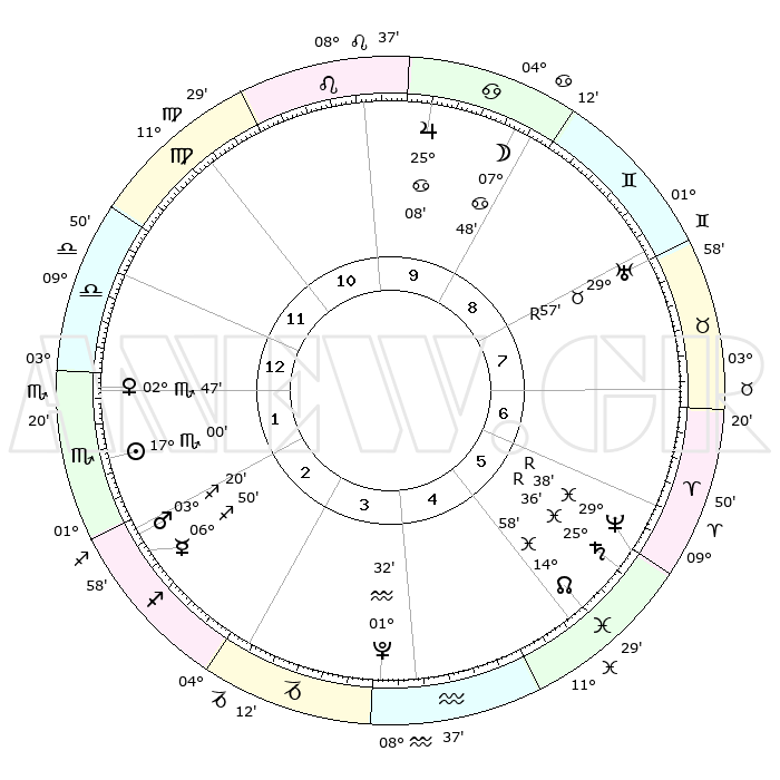 | | ΘΕΣΕΙΣ ΠΛΑΝΗΤΩΝ ΑΣΤΡΟΛΟΓΙΚΟΥ ΧΑΡΤΗ ΤΗΣ ΣΤΙΓΜΗΣ ΑΥΤΗΣ | | | | Πλανήτης | Ζώδιο | Μοίρες | Δεκαήμ. | Σε οίκο | Απόκλιση | | Ακμές των οίκων | | Ηλιος | Σκορπιός | 16°55' | Δεύτερο | 2 | 16 S 53 | | 1ος | 10°23' | Ζυγός | | Σελήνη | Καρκίνος | 06°39' | Πρώτο | 9 | 28 N 01 | | 2ος | 07°40' | Σκορπιός | | Ερμής | Τοξότης | 06°49' | Πρώτο | 2 | 23 S 52 | | 3ος | 08°30' | Τοξότης | | Αφροδίτη | Σκορπιός | 02°42' | Πρώτο | 1 | 11 S 08 | | 4ος | 11°42' | Αιγόκερως | | Αρης | Τοξότης | 03°16' | Πρώτο | 2 | 21 S 16 | | 5ος | 14°38' | Υδροχόος | | Δίας | Καρκίνος | 25°08' | Τρίτο | 10 | 21 N 12 | | 6ος | 14°37' | Ιχθείς | | Κρόνος | Ιχθείς | 25°36'R | Τρίτο | 6 | 03 S 59 | | 7ος | 10°23' | Κριός | | Ουρανός | Ταύρος | 29°57'R | Τρίτο | 8 | 19 N 56 | | 8ος | 07°40' | Ταύρος | | Ποσειδώνας | Ιχθείς | 29°38'R | Τρίτο | 6 | 01 S 24 | | 9ος | 08°30' | Δίδυμοι | | Πλούτωνας | Υδροχόος | 01°32' | Πρώτο | 4 | 23 S 29 | | 10ος | 11°42' | Καρκίνος | | Β. Δεσμός | Ιχθείς | 14°58' | Δεύτερο | 6 | 05 S 55 | | 11ος | 14°38' | Λέων | | Ωροσκόπος | Ζυγός | 10°23' | Δεύτερο | | | 12ος | 14°37' | Παρθένος | | Μεσουράνημα | Καρκίνος | 11°42' | Δεύτερο | | | |
