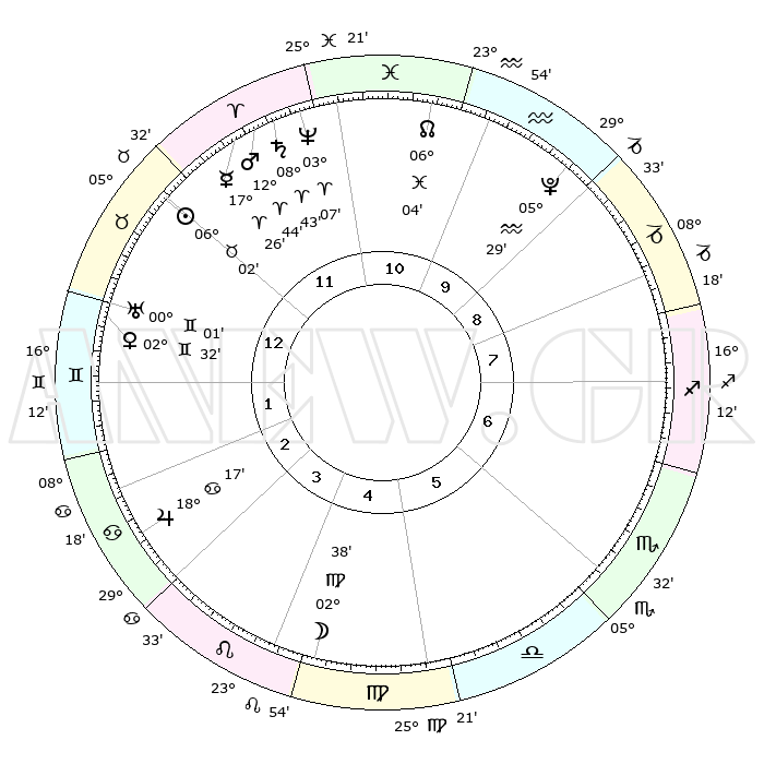 | | ΘΕΣΕΙΣ ΠΛΑΝΗΤΩΝ ΑΣΤΡΟΛΟΓΙΚΟΥ ΧΑΡΤΗ ΤΗΣ ΣΤΙΓΜΗΣ ΑΥΤΗΣ | | | | Πλανήτης | Ζώδιο | Μοίρες | Δεκαήμ. | Σε οίκο | Απόκλιση | | Ακμές των οίκων | | Ηλιος | Ταύρος | 05°58' | Πρώτο | 12 | 13 N 31 | | 1ος | 23°18' | Ταύρος | | Σελήνη | Παρθένος | 01°53' | Πρώτο | 5 | 11 N 15 | | 2ος | 19°33' | Δίδυμοι | | Ερμής | Κριός | 17°21' | Δεύτερο | 12 | 04 N 38 | | 3ος | 11°16' | Καρκίνος | | Αφροδίτη | Δίδυμοι | 02°28' | Πρώτο | 1 | 21 N 19 | | 4ος | 03°36' | Λέων | | Αρης | Κριός | 12°41' | Δεύτερο | 12 | 04 N 10 | | 5ος | 00°58' | Παρθένος | | Δίας | Καρκίνος | 18°16' | Δεύτερο | 3 | 22 N 34 | | 6ος | 08°16' | Ζυγός | | Κρόνος | Κριός | 08°43' | Πρώτο | 12 | 01 N 28 | | 7ος | 23°18' | Σκορπιός | | Ουρανός | Δίδυμοι | 00°01' | Πρώτο | 1 | 19 N 59 | | 8ος | 19°33' | Τοξότης | | Ποσειδώνας | Κριός | 03°06' | Πρώτο | 11 | 00 N 02 | | 9ος | 11°16' | Αιγόκερως | | Πλούτωνας | Υδροχόος | 05°29' | Πρώτο | 10 | 22 S 48 | | 10ος | 03°36' | Υδροχόος | | Β. Δεσμός | Ιχθείς | 06°04' | Πρώτο | 11 | 09 S 17 | | 11ος | 00°58' | Ιχθείς | | Ωροσκόπος | Ταύρος | 23°18' | Τρίτο | | | 12ος | 08°16' | Κριός | | Μεσουράνημα | Υδροχόος | 03°36' | Πρώτο | | | |