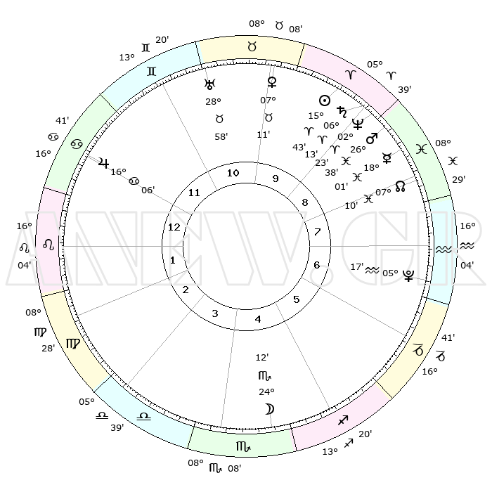 | | ΘΕΣΕΙΣ ΠΛΑΝΗΤΩΝ ΑΣΤΡΟΛΟΓΙΚΟΥ ΧΑΡΤΗ ΤΗΣ ΣΤΙΓΜΗΣ ΑΥΤΗΣ | | | | Πλανήτης | Ζώδιο | Μοίρες | Δεκαήμ. | Σε οίκο | Απόκλιση | | Ακμές των οίκων | | Ηλιος | Κριός | 15°25' | Δεύτερο | 12 | 06 N 04 | | 1ος | 26°40' | Κριός | | Σελήνη | Σκορπιός | 20°33' | Τρίτο | 7 | 22 S 37 | | 2ος | 29°49' | Ταύρος | | Ερμής | Ιχθείς | 17°41' | Δεύτερο | 12 | 06 S 36 | | 3ος | 23°43' | Δίδυμοι | | Αφροδίτη | Ταύρος | 06°49' | Πρώτο | 1 | 13 N 32 | | 4ος | 15°24' | Καρκίνος | | Αρης | Ιχθείς | 26°24' | Τρίτο | 12 | 02 S 22 | | 5ος | 09°29' | Λέων | | Δίας | Καρκίνος | 16°05' | Δεύτερο | 4 | 22 N 50 | | 6ος | 11°33' | Παρθένος | | Κρόνος | Κριός | 06°11' | Πρώτο | 12 | 00 N 30 | | 7ος | 26°40' | Ζυγός | | Ουρανός | Ταύρος | 28°57' | Τρίτο | 1 | 19 N 45 | | 8ος | 29°49' | Σκορπιός | | Ποσειδώνας | Κριός | 02°22' | Πρώτο | 12 | 00 S 16 | | 9ος | 23°43' | Τοξότης | | Πλούτωνας | Υδροχόος | 05°17' | Πρώτο | 10 | 22 S 47 | | 10ος | 15°24' | Αιγόκερως | | Β. Δεσμός | Ιχθείς | 07°11' | Πρώτο | 11 | 08 S 52 | | 11ος | 09°29' | Υδροχόος | | Ωροσκόπος | Κριός | 26°40' | Τρίτο | | | 12ος | 11°33' | Ιχθείς | | Μεσουράνημα | Αιγόκερως | 15°24' | Δεύτερο | | | |