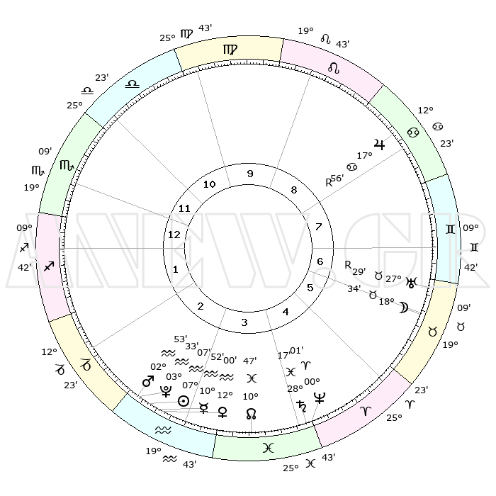 | | ΘΕΣΕΙΣ ΠΛΑΝΗΤΩΝ ΑΣΤΡΟΛΟΓΙΚΟΥ ΧΑΡΤΗ ΤΗΣ ΣΤΙΓΜΗΣ ΑΥΤΗΣ | | | | Πλανήτης | Ζώδιο | Μοίρες | Δεκαήμ. | Σε οίκο | Απόκλιση | | Ακμές των οίκων | | Ηλιος | Υδροχόος | 07°03' | Πρώτο | 3 | 18 S 30 | | 1ος | 19°45' | Σκορπιός | | Σελήνη | Ταύρος | 17°36' | Δεύτερο | 6 | 21 N 43 | | 2ος | 19°41' | Τοξότης | | Ερμής | Υδροχόος | 10°45' | Δεύτερο | 3 | 19 S 32 | | 3ος | 23°48' | Αιγόκερως | | Αφροδίτη | Υδροχόος | 11°55' | Δεύτερο | 3 | 18 S 26 | | 4ος | 29°23' | Υδροχόος | | Αρης | Υδροχόος | 02°50' | Πρώτο | 3 | 20 S 31 | | 5ος | 01°28' | Κριός | | Δίας | Καρκίνος | 17°56'R | Δεύτερο | 8 | 22 N 31 | | 6ος | 27°54' | Κριός | | Κρόνος | Ιχθείς | 28°17' | Τρίτο | 4 | 02 S 41 | | 7ος | 19°45' | Ταύρος | | Ουρανός | Ταύρος | 27°29'R | Τρίτο | 7 | 19 N 24 | | 8ος | 19°41' | Δίδυμοι | | Ποσειδώνας | Κριός | 00°01' | Πρώτο | 4 | 01 S 12 | | 9ος | 23°48' | Καρκίνος | | Πλούτωνας | Υδροχόος | 03°33' | Πρώτο | 3 | 23 S 03 | | 10ος | 29°23' | Λέων | | Β. Δεσμός | Ιχθείς | 10°48' | Δεύτερο | 4 | 07 S 31 | | 11ος | 01°28' | Ζυγός | | Ωροσκόπος | Σκορπιός | 19°45' | Δεύτερο | | | 12ος | 27°54' | Ζυγός | | Μεσουράνημα | Λέων | 29°23' | Τρίτο | | | |