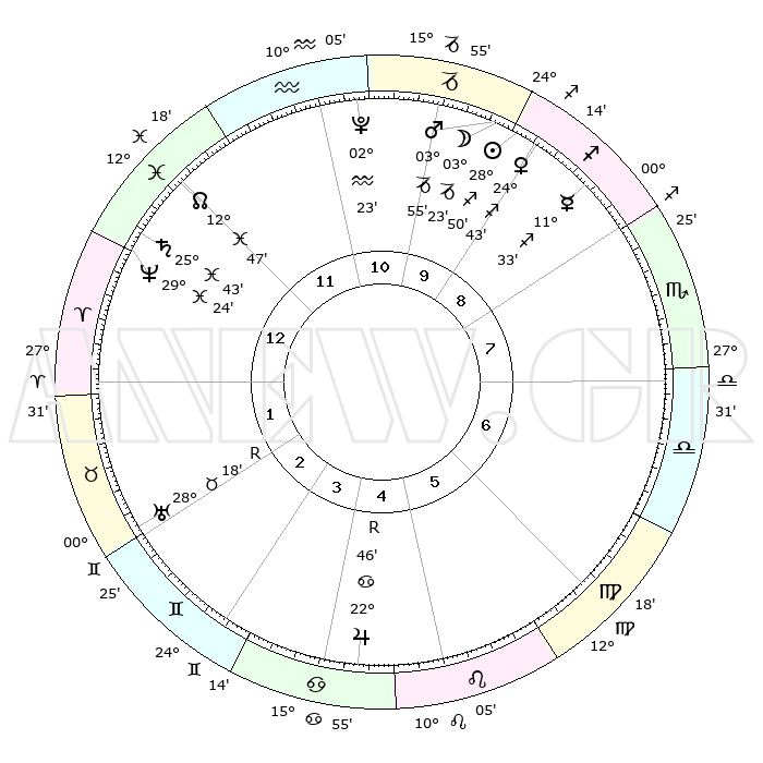 | | ΘΕΣΕΙΣ ΠΛΑΝΗΤΩΝ ΑΣΤΡΟΛΟΓΙΚΟΥ ΧΑΡΤΗ ΤΗΣ ΣΤΙΓΜΗΣ ΑΥΤΗΣ | | | | Πλανήτης | Ζώδιο | Μοίρες | Δεκαήμ. | Σε οίκο | Απόκλιση | | Ακμές των οίκων | | Ηλιος | Τοξότης | 28°42' | Τρίτο | 11 | 23 S 26 | | 1ος | 09°17' | Υδροχόος | | Σελήνη | Αιγόκερως | 01°40' | Πρώτο | 11 | 28 S 08 | | 2ος | 24°35' | Ιχθείς | | Ερμής | Τοξότης | 11°21' | Δεύτερο | 10 | 21 S 17 | | 3ος | 01°25' | Ταύρος | | Αφροδίτη | Τοξότης | 24°33' | Τρίτο | 11 | 23 S 22 | | 4ος | 28°23' | Ταύρος | | Αρης | Αιγόκερως | 03°49' | Πρώτο | 11 | 24 S 11 | | 5ος | 20°34' | Δίδυμοι | | Δίας | Καρκίνος | 22°47'R | Τρίτο | 6 | 21 N 43 | | 6ος | 12°26' | Καρκίνος | | Κρόνος | Ιχθείς | 25°43' | Τρίτο | 2 | 03 S 49 | | 7ος | 09°17' | Λέων | | Ουρανός | Ταύρος | 28°18'R | Τρίτο | 3 | 19 N 35 | | 8ος | 24°35' | Παρθένος | | Ποσειδώνας | Ιχθείς | 29°24' | Τρίτο | 2 | 01 S 28 | | 9ος | 01°25' | Σκορπιός | | Πλούτωνας | Υδροχόος | 02°23' | Πρώτο | 12 | 23 S 18 | | 10ος | 28°23' | Σκορπιός | | Β. Δεσμός | Ιχθείς | 12°47' | Δεύτερο | 1 | 06 S 45 | | 11ος | 20°34' | Τοξότης | | Ωροσκόπος | Υδροχόος | 09°17' | Πρώτο | | | 12ος | 12°26' | Αιγόκερως | | Μεσουράνημα | Σκορπιός | 28°23' | Τρίτο | | | |