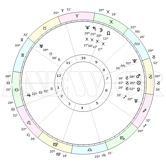 | | ΘΕΣΕΙΣ ΠΛΑΝΗΤΩΝ ΑΣΤΡΟΛΟΓΙΚΟΥ ΧΑΡΤΗ ΤΗΣ ΣΤΙΓΜΗΣ ΑΥΤΗΣ | | | | Πλανήτης | Ζώδιο | Μοίρες | Δεκαήμ. | Σε οίκο | Απόκλιση | | Ακμές των οίκων | | Ηλιος | Αιγόκερως | 05°02' | Πρώτο | 7 | 23 S 20 | | 1ος | 13°56' | Δίδυμοι | | Σελήνη | Ιχθείς | 19°47' | Δεύτερο | 10 | 03 S 21 | | 2ος | 06°21' | Καρκίνος | | Ερμής | Τοξότης | 20°28' | Τρίτο | 7 | 23 S 02 | | 3ος | 27°34' | Καρκίνος | | Αφροδίτη | Αιγόκερως | 02°23' | Πρώτο | 7 | 23 S 43 | | 4ος | 21°39' | Λέων | | Αρης | Αιγόκερως | 08°33' | Πρώτο | 8 | 24 S 01 | | 5ος | 22°40' | Παρθένος | | Δίας | Καρκίνος | 22°03'R | Τρίτο | 2 | 21 N 51 | | 6ος | 02°43' | Σκορπιός | | Κρόνος | Ιχθείς | 25°60' | Τρίτο | 11 | 03 S 41 | | 7ος | 13°56' | Τοξότης | | Ουρανός | Ταύρος | 28°06'R | Τρίτο | 12 | 19 N 32 | | 8ος | 06°21' | Αιγόκερως | | Ποσειδώνας | Ιχθείς | 29°27' | Τρίτο | 11 | 01 S 27 | | 9ος | 27°34' | Αιγόκερως | | Πλούτωνας | Υδροχόος | 02°34' | Πρώτο | 9 | 23 S 15 | | 10ος | 21°39' | Υδροχόος | | Β. Δεσμός | Ιχθείς | 12°27' | Δεύτερο | 10 | 06 S 53 | | 11ος | 22°40' | Ιχθείς | | Ωροσκόπος | Δίδυμοι | 13°56' | Δεύτερο | | | 12ος | 02°43' | Ταύρος | | Μεσουράνημα | Υδροχόος | 21°39' | Τρίτο | | | |