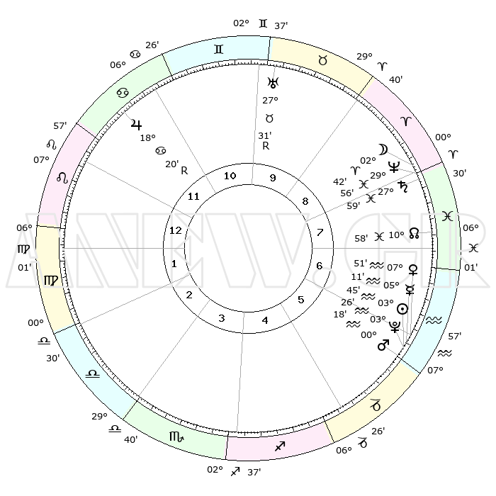 | | ΘΕΣΕΙΣ ΠΛΑΝΗΤΩΝ ΑΣΤΡΟΛΟΓΙΚΟΥ ΧΑΡΤΗ ΤΗΣ ΣΤΙΓΜΗΣ ΑΥΤΗΣ | | | | Πλανήτης | Ζώδιο | Μοίρες | Δεκαήμ. | Σε οίκο | Απόκλιση | | Ακμές των οίκων | | Ηλιος | Υδροχόος | 03°42' | Πρώτο | 6 | 19 S 19 | | 1ος | 18°52' | Λέων | | Σελήνη | Κριός | 01°54' | Πρώτο | 8 | 02 N 36 | | 2ος | 11°33' | Παρθένος | | Ερμής | Υδροχόος | 05°05' | Πρώτο | 6 | 21 S 01 | | 3ος | 09°04' | Ζυγός | | Αφροδίτη | Υδροχόος | 07°46' | Πρώτο | 6 | 19 S 29 | | 4ος | 11°41' | Σκορπιός | | Αρης | Υδροχόος | 00°15' | Πρώτο | 6 | 21 S 05 | | 5ος | 16°41' | Τοξότης | | Δίας | Καρκίνος | 18°21'R | Δεύτερο | 11 | 22 N 28 | | 6ος | 19°42' | Αιγόκερως | | Κρόνος | Ιχθείς | 27°59' | Τρίτο | 8 | 02 S 49 | | 7ος | 18°52' | Υδροχόος | | Ουρανός | Ταύρος | 27°31'R | Τρίτο | 10 | 19 N 25 | | 8ος | 11°33' | Ιχθείς | | Ποσειδώνας | Ιχθείς | 29°56' | Τρίτο | 8 | 01 S 14 | | 9ος | 09°04' | Κριός | | Πλούτωνας | Υδροχόος | 03°26' | Πρώτο | 6 | 23 S 04 | | 10ος | 11°41' | Ταύρος | | Β. Δεσμός | Ιχθείς | 10°58' | Δεύτερο | 7 | 07 S 27 | | 11ος | 16°41' | Δίδυμοι | | Ωροσκόπος | Λέων | 18°52' | Δεύτερο | | | 12ος | 19°42' | Καρκίνος | | Μεσουράνημα | Ταύρος | 11°41' | Δεύτερο | | | |