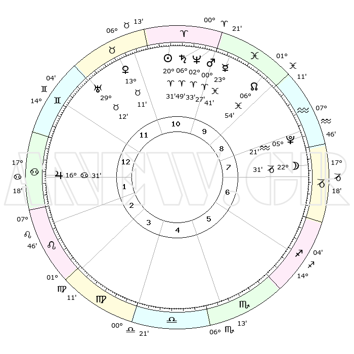 | | ΘΕΣΕΙΣ ΠΛΑΝΗΤΩΝ ΑΣΤΡΟΛΟΓΙΚΟΥ ΧΑΡΤΗ ΤΗΣ ΣΤΙΓΜΗΣ ΑΥΤΗΣ | | | | Πλανήτης | Ζώδιο | Μοίρες | Δεκαήμ. | Σε οίκο | Απόκλιση | | Ακμές των οίκων | | Ηλιος | Κριός | 20°27' | Τρίτο | 11 | 07 N 59 | | 1ος | 25°34' | Δίδυμοι | | Σελήνη | Αιγόκερως | 21°42' | Τρίτο | 8 | 25 S 23 | | 2ος | 16°41' | Καρκίνος | | Ερμής | Ιχθείς | 23°36' | Τρίτο | 10 | 04 S 43 | | 3ος | 08°14' | Λέων | | Αφροδίτη | Ταύρος | 13°06' | Δεύτερο | 11 | 15 N 44 | | 4ος | 03°52' | Παρθένος | | Αρης | Κριός | 00°24' | Πρώτο | 10 | 00 S 46 | | 5ος | 07°03' | Ζυγός | | Δίας | Καρκίνος | 16°31' | Δεύτερο | 1 | 22 N 47 | | 6ος | 17°18' | Σκορπιός | | Κρόνος | Κριός | 06°49' | Πρώτο | 10 | 00 N 44 | | 7ος | 25°34' | Τοξότης | | Ουρανός | Ταύρος | 29°12' | Τρίτο | 12 | 19 N 48 | | 8ος | 16°41' | Αιγόκερως | | Ποσειδώνας | Κριός | 02°33' | Πρώτο | 10 | 00 S 11 | | 9ος | 08°14' | Υδροχόος | | Πλούτωνας | Υδροχόος | 05°21' | Πρώτο | 8 | 22 S 47 | | 10ος | 03°52' | Ιχθείς | | Β. Δεσμός | Ιχθείς | 06°55' | Πρώτο | 10 | 08 S 58 | | 11ος | 07°03' | Κριός | | Ωροσκόπος | Δίδυμοι | 25°34' | Τρίτο | | | 12ος | 17°18' | Ταύρος | | Μεσουράνημα | Ιχθείς | 03°52' | Πρώτο | | | |
