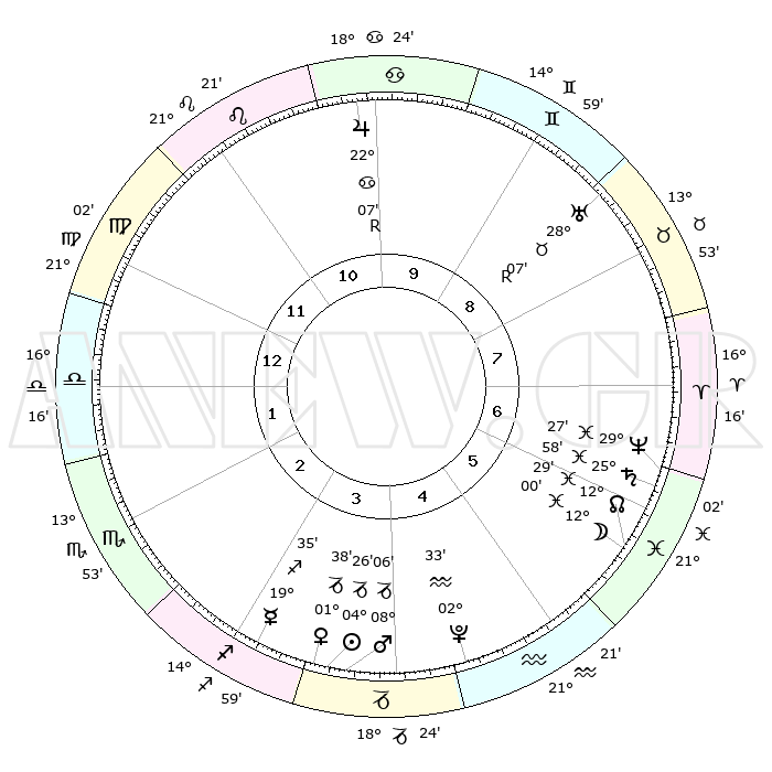 | | ΘΕΣΕΙΣ ΠΛΑΝΗΤΩΝ ΑΣΤΡΟΛΟΓΙΚΟΥ ΧΑΡΤΗ ΤΗΣ ΣΤΙΓΜΗΣ ΑΥΤΗΣ | | | | Πλανήτης | Ζώδιο | Μοίρες | Δεκαήμ. | Σε οίκο | Απόκλιση | | Ακμές των οίκων | | Ηλιος | Αιγόκερως | 04°21' | Πρώτο | 4 | 23 S 22 | | 1ος | 23°58' | Παρθένος | | Σελήνη | Ιχθείς | 11°01' | Δεύτερο | 6 | 07 S 27 | | 2ος | 20°05' | Ζυγός | | Ερμής | Τοξότης | 19°29' | Δεύτερο | 3 | 22 S 52 | | 3ος | 20°17' | Σκορπιός | | Αφροδίτη | Αιγόκερως | 01°33' | Πρώτο | 4 | 23 S 42 | | 4ος | 23°13' | Τοξότης | | Αρης | Αιγόκερως | 08°02' | Πρώτο | 4 | 24 S 02 | | 5ος | 26°18' | Αιγόκερως | | Δίας | Καρκίνος | 22°08'R | Τρίτο | 10 | 21 N 50 | | 6ος | 26°58' | Υδροχόος | | Κρόνος | Ιχθείς | 25°58' | Τρίτο | 7 | 03 S 42 | | 7ος | 23°58' | Ιχθείς | | Ουρανός | Ταύρος | 28°07'R | Τρίτο | 9 | 19 N 33 | | 8ος | 20°05' | Κριός | | Ποσειδώνας | Ιχθείς | 29°27' | Τρίτο | 7 | 01 S 27 | | 9ος | 20°17' | Ταύρος | | Πλούτωνας | Υδροχόος | 02°33' | Πρώτο | 5 | 23 S 15 | | 10ος | 23°13' | Δίδυμοι | | Β. Δεσμός | Ιχθείς | 12°30' | Δεύτερο | 6 | 06 S 52 | | 11ος | 26°18' | Καρκίνος | | Ωροσκόπος | Παρθένος | 23°58' | Τρίτο | | | 12ος | 26°58' | Λέων | | Μεσουράνημα | Δίδυμοι | 23°13' | Τρίτο | | | |